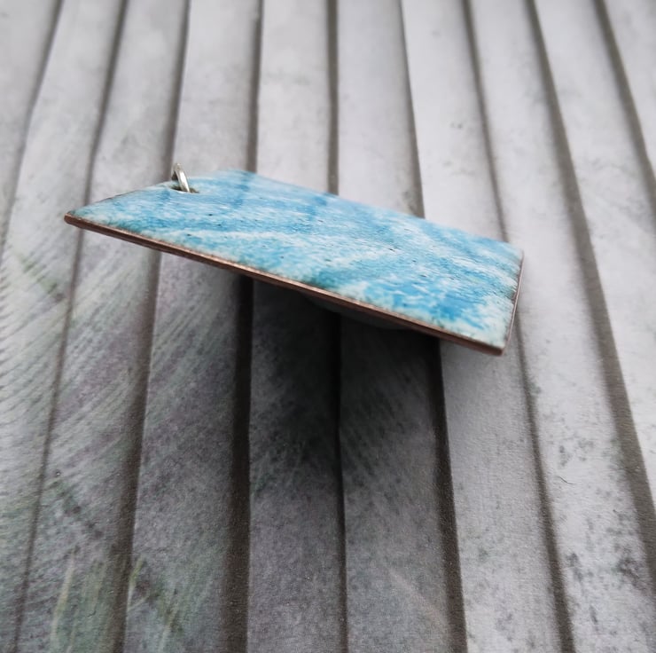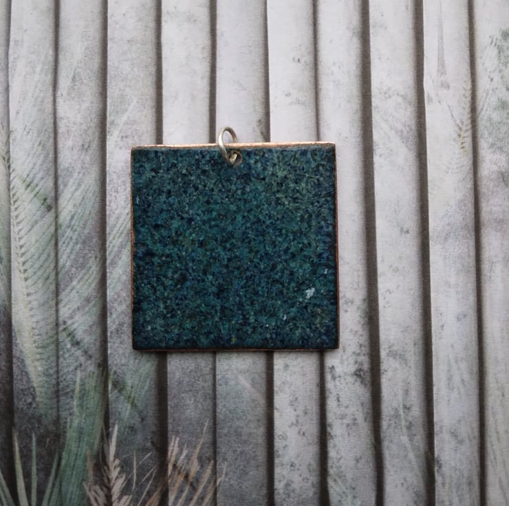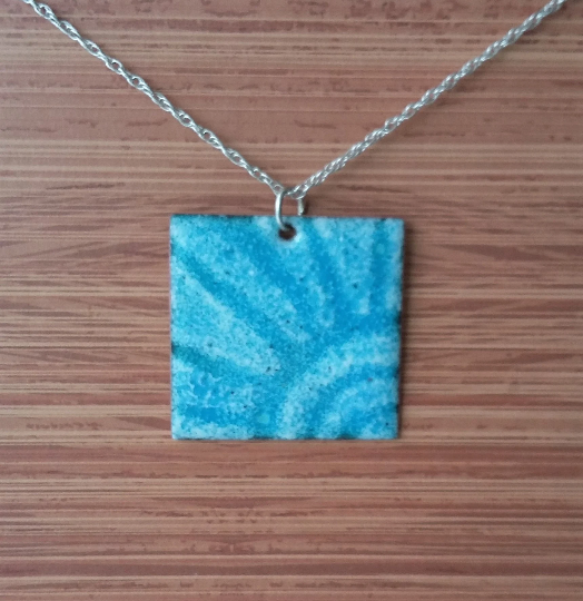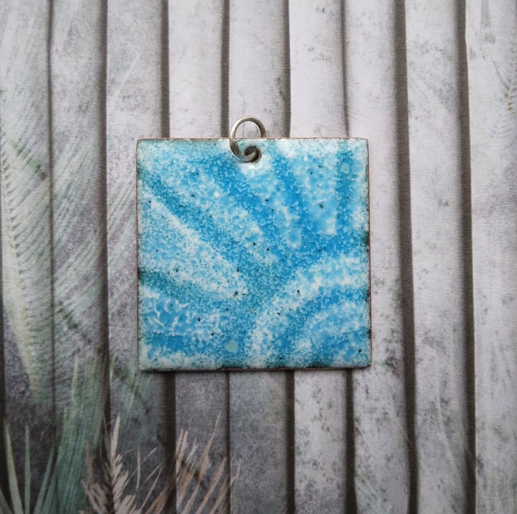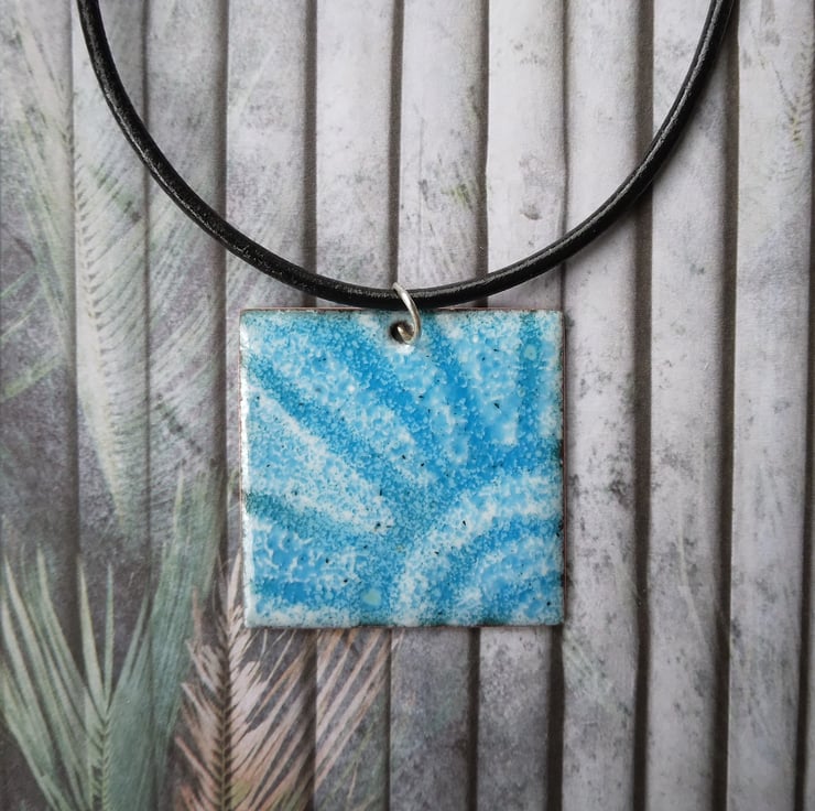 Square enamelled copper pendant in shades of turquoise and white with a sunburst design. The pendant has been kiln-fired and measures approximately 30mm by 30mm. To complete the piece aesthetically and for a smooth finish against the skin, the back has been given two coats of dark blue tweed-effect enamel. It comes complete with a soldered sterling silver jump ring (6mm) and is supplied with a little organza pouch. An 18” sterling silver rope chain, or a 2mm leather cord (selection of lengths) finished with a magnetic clasp, can be purchased separately from my shop if needed – please see separate listings. If you are using your own chain, please ensure that it will fit through the 6mm jump ring, allowing for the thickness of the pendant.