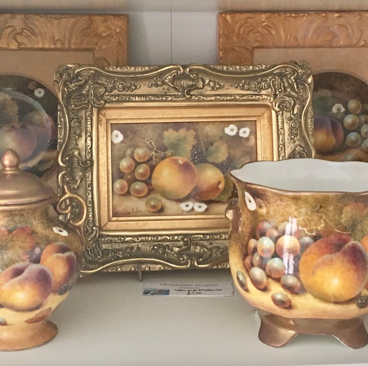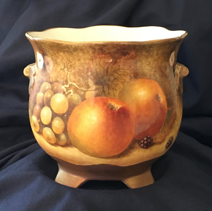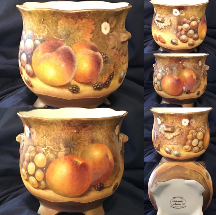 Handpainted bone china planter. Painted all round ( 15 in circumference) 5 in wire and 5 in high. Peaches,apples,grapes, blackberries and strawberries. A “ one off “ original piece. First sketched then painted and fired five separate times in my Worcestershire studio., to capture the depth of colour and detail. Two gilding fires as well .