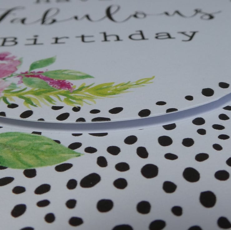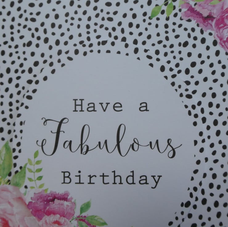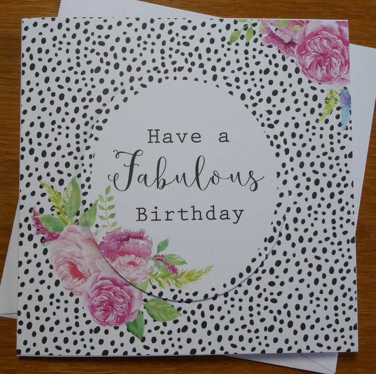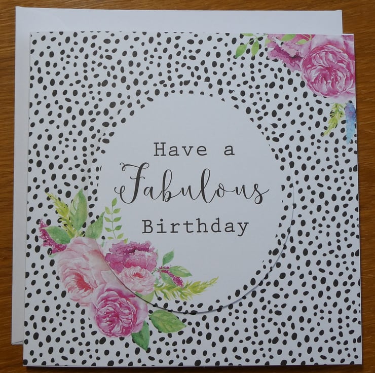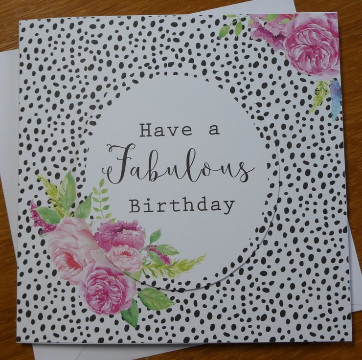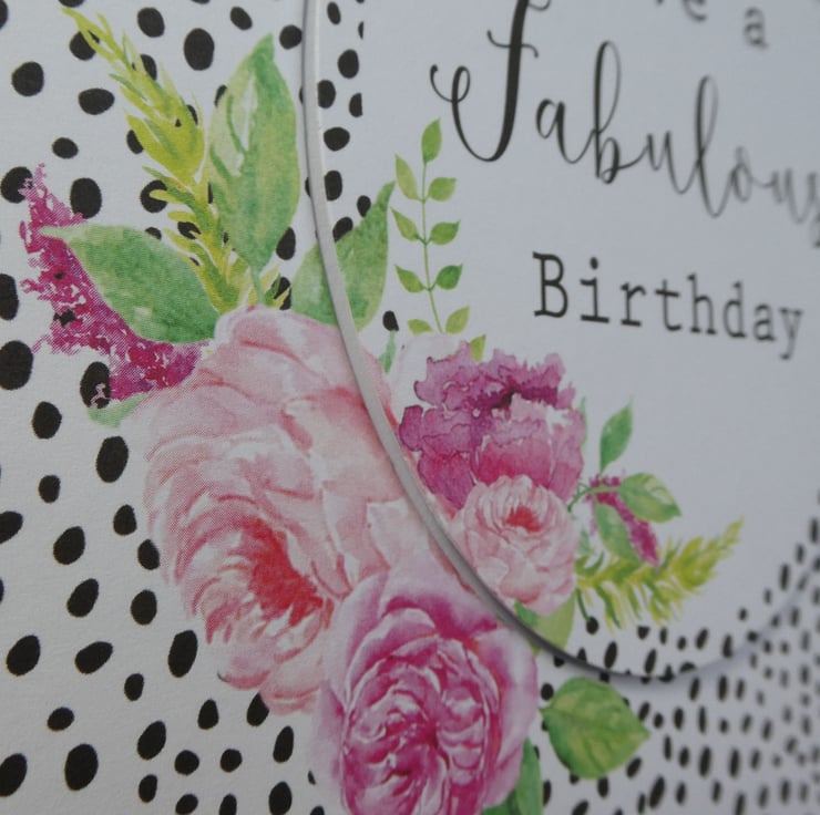This floral birthday card has a background of irregular black dots and pink roses. A central oval card topper with the message 'Have a Fabulous Birthday' and a matching dots and roses design has been attached with foam pads to lift it slightly from the background.