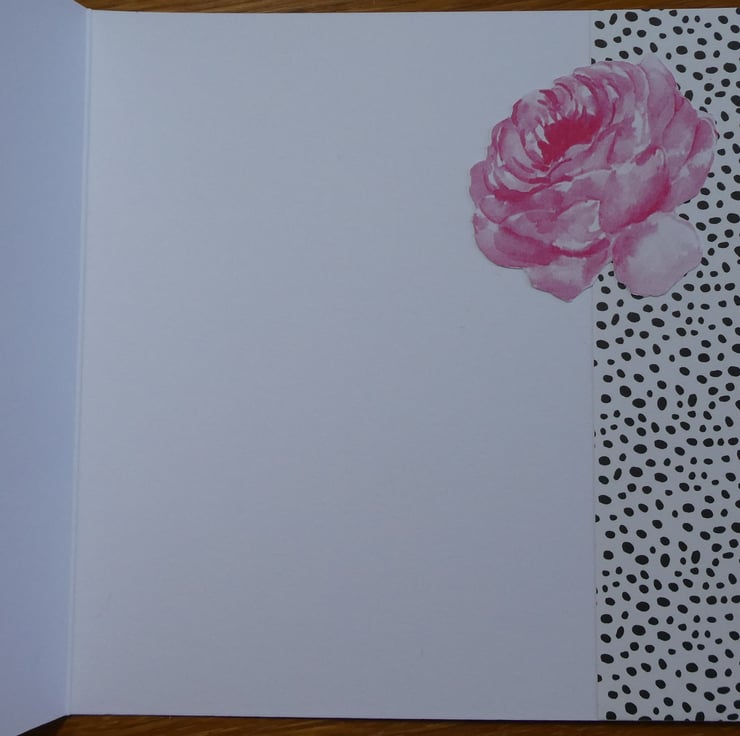 The inside of the card has been finished with a strip of matching black and white paper and a hand cut pink rose.