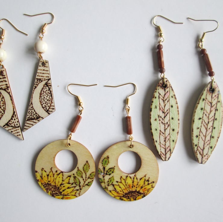 A lovely set of earrings ready for her. These stylish wooden earrings are hand made and burned pattern by pyrography and painted where needed.