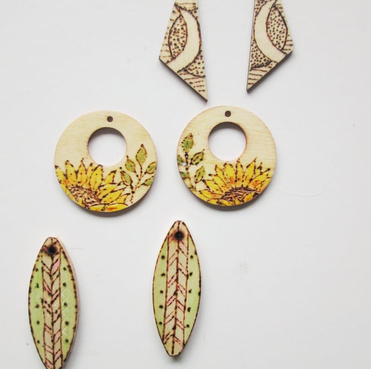 The wood was sanded and shaped first. Next I have created the pattern by woodburning/pyrography and the painting in acrylic paints. The last step was to varnish the wood and painting to protect.