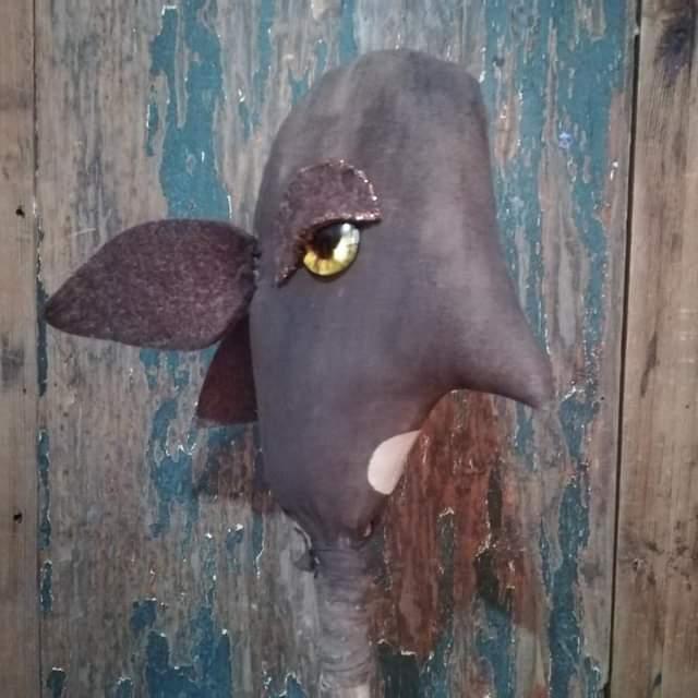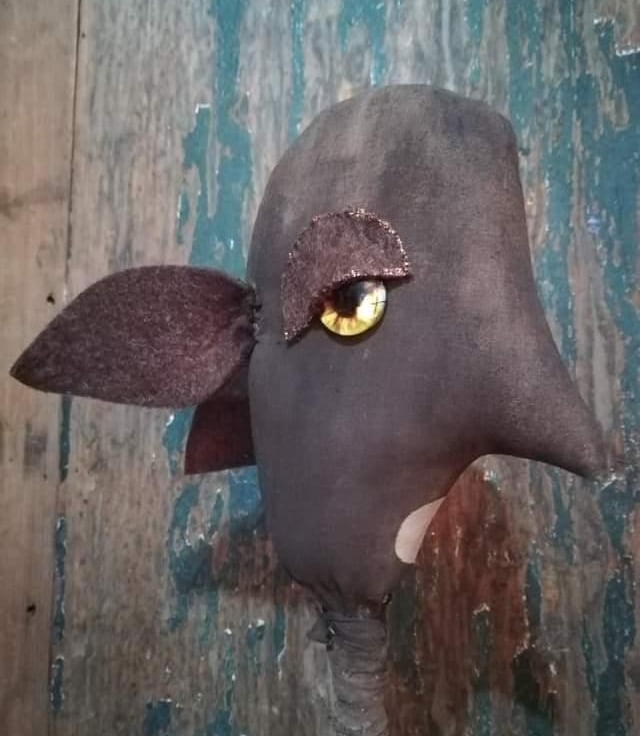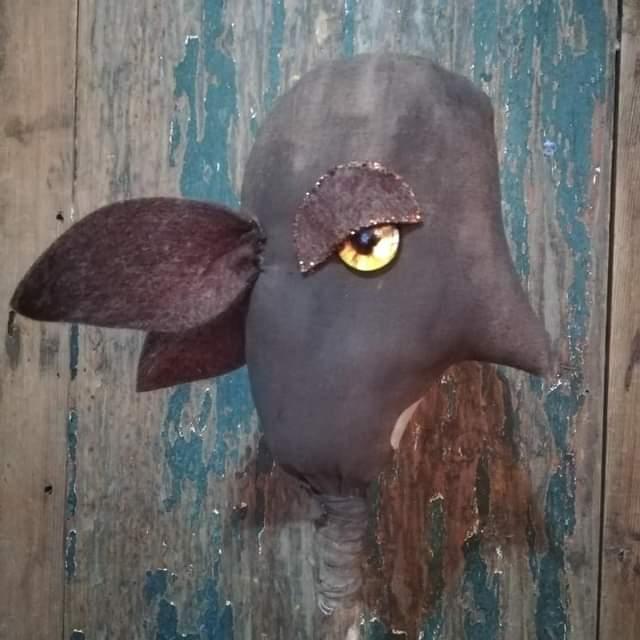 I made this grungy style goblin head piece in fabric using my own hand drawn pattern, it is then grunged , dyed and stained,