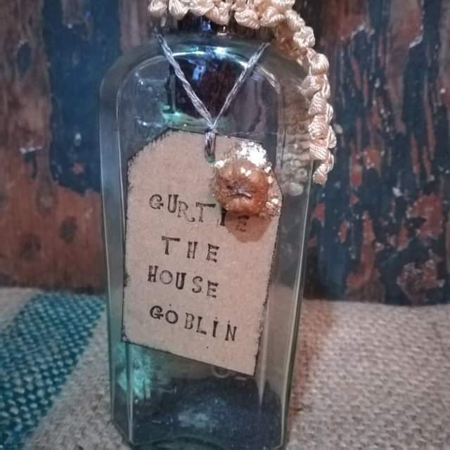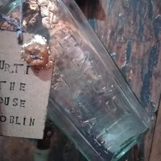 He sits in a vintage fruit sugar bottle with a hand stamped tag,