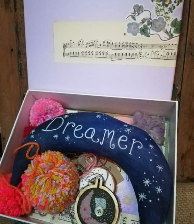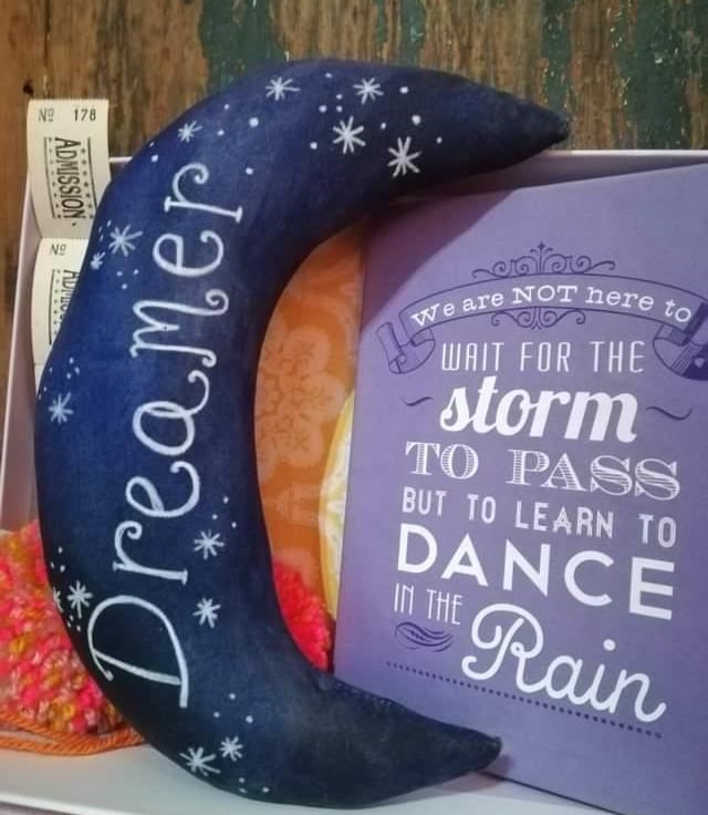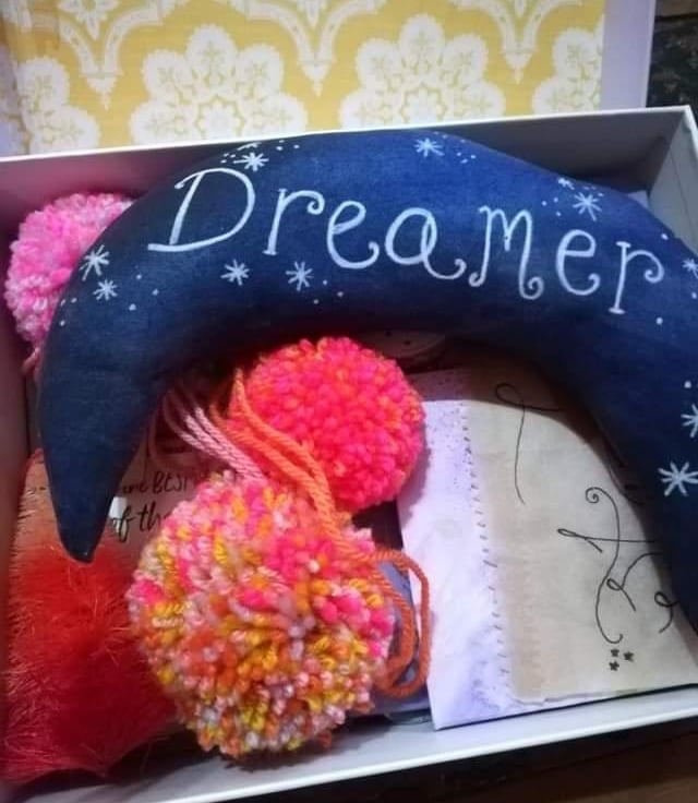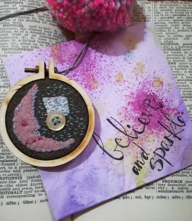 A textile art , hand painted Dreamer moon wall hanging (8 inches)