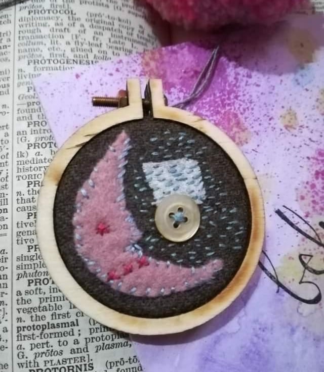 A hand stitched/ applique moon hanging decoration in wooden frame (aprox 2 inches)