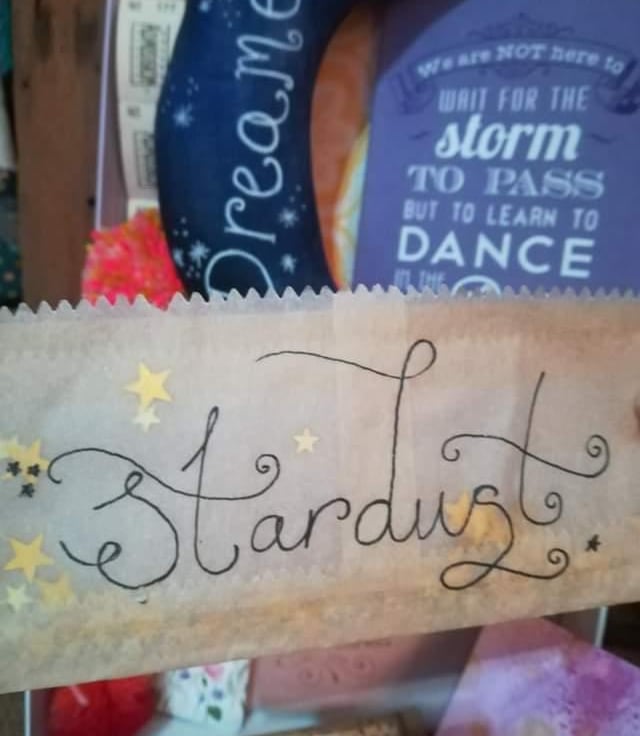 vintage paper tickets, handmade pom poms, a vintage paper envelope containing hand mixed glitter and star confetti (great for journalling etc)