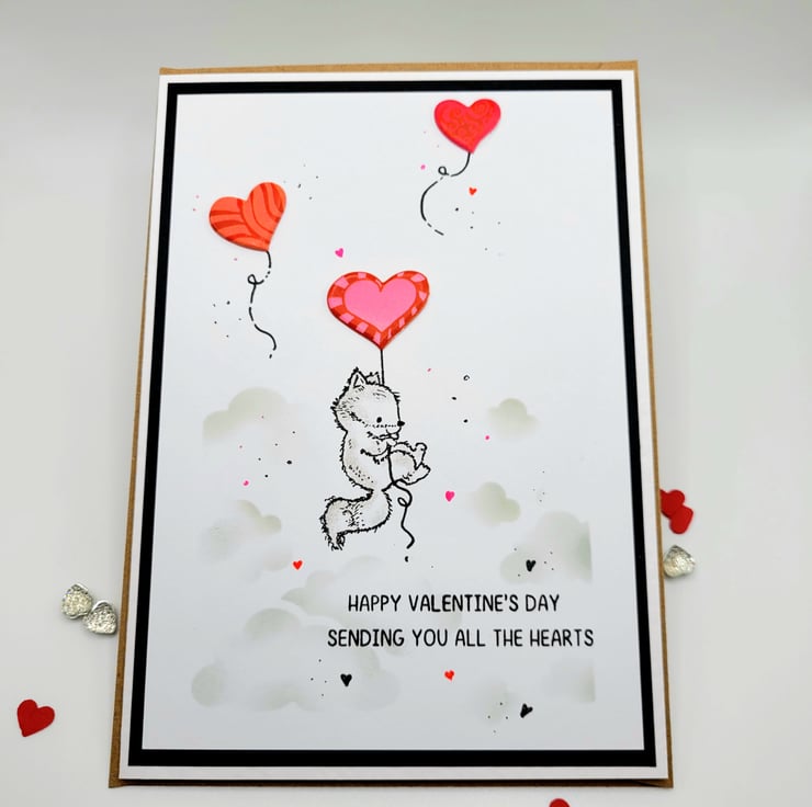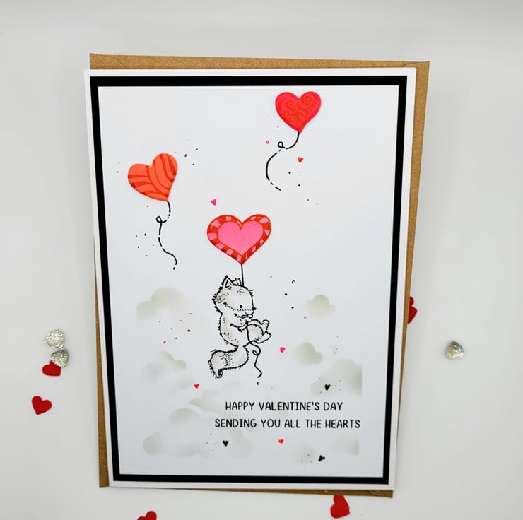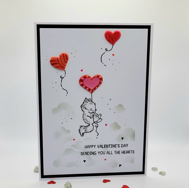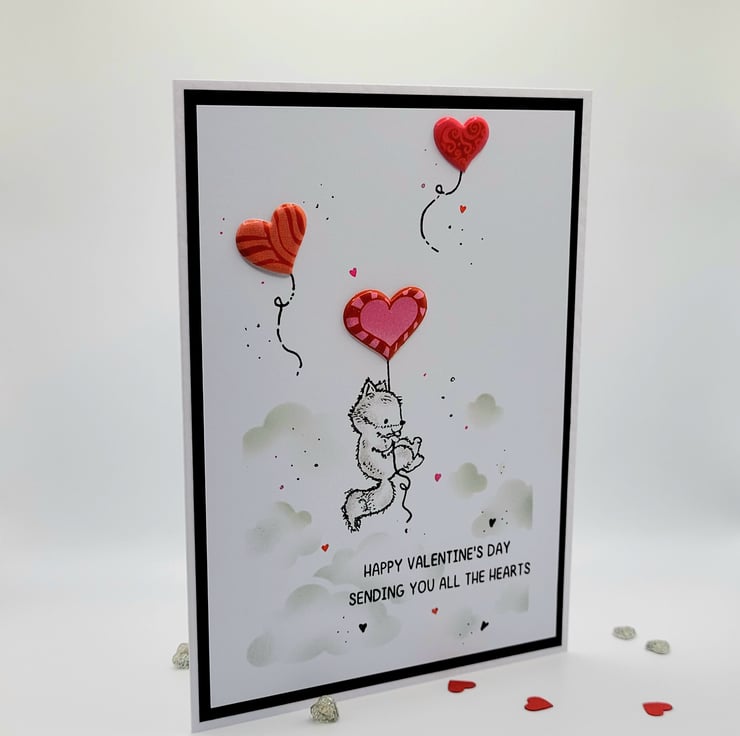 The card has a white, black, red and grey colour palette and features a fox with a heart shaped balloon and a cloudy sky stencilled in soft grey ink. The card base is handmade from quality heavyweight white hammered card. There is a layer of black paper and a white layer of card with the focal design. Designed, stamped, coloured with Arteza Art Pencils, by hand, in my craft room.