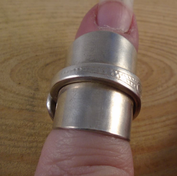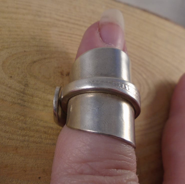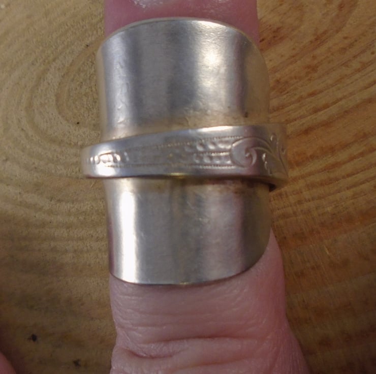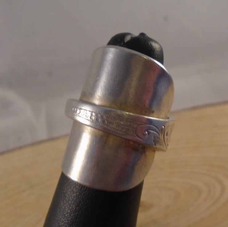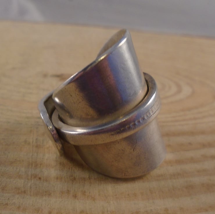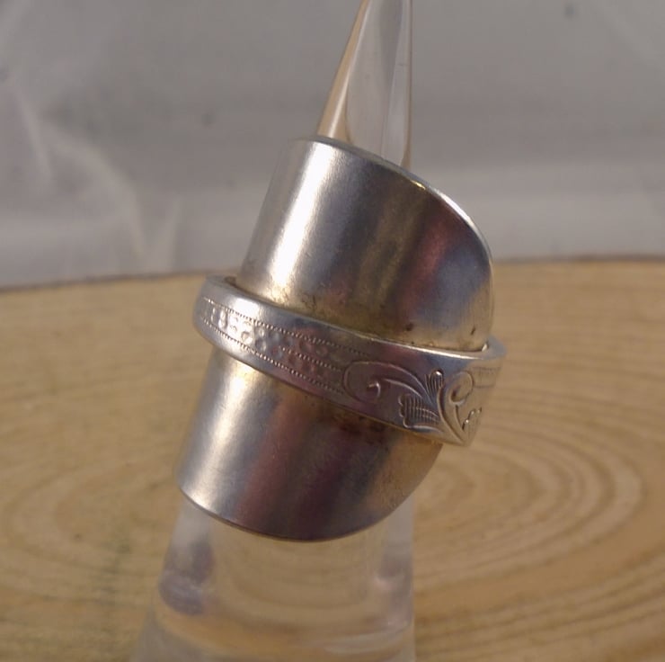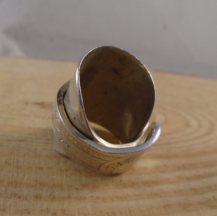 A pretty statement ring, hand made from an old silver plated teaspoon. The bowl of the spoon has been flattened, and then the spoon has been bent around a ring mandrel to form a ring with the handle overlapping the flattened bowl.