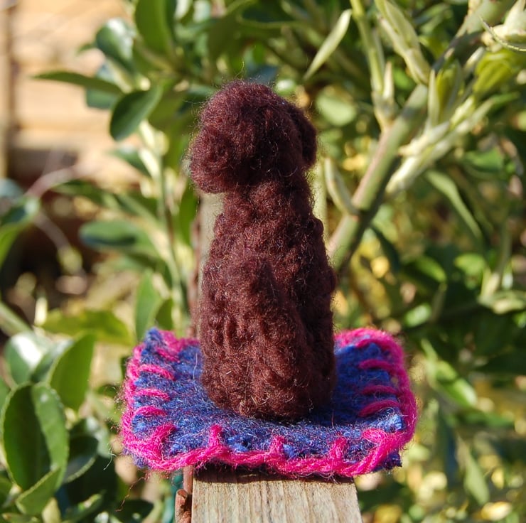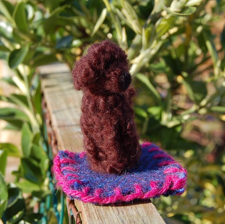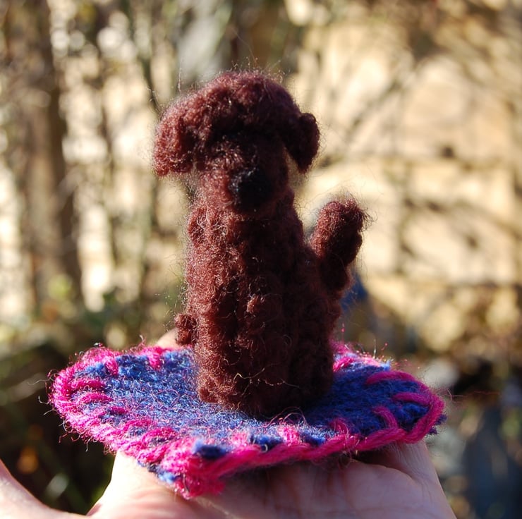 I have made this dog using wool fibers needle felted into shape and attached to a tweed wool mat with hand stitched edging.