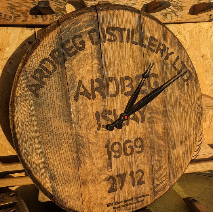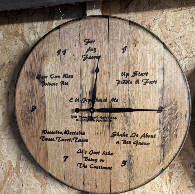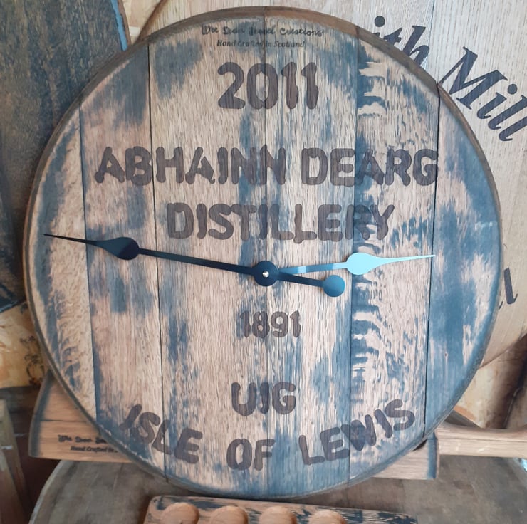 Custom designed and made from a genuine, solid oak whisky barrel top. Choose your favourite distillery and year or have a clock face designed specifically for you. Each clock is made to order so we can work in names, birthdays or other info. Or you can go for a completely unique design. Fitted with a battery operated high torq clock mechanism.