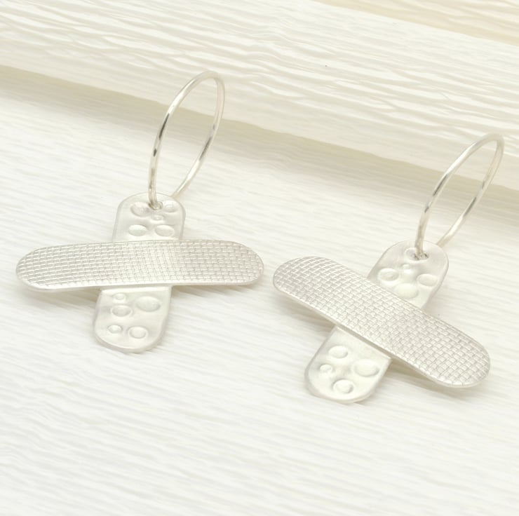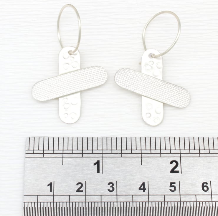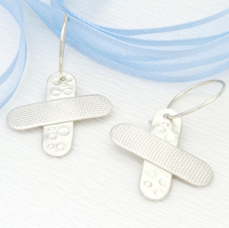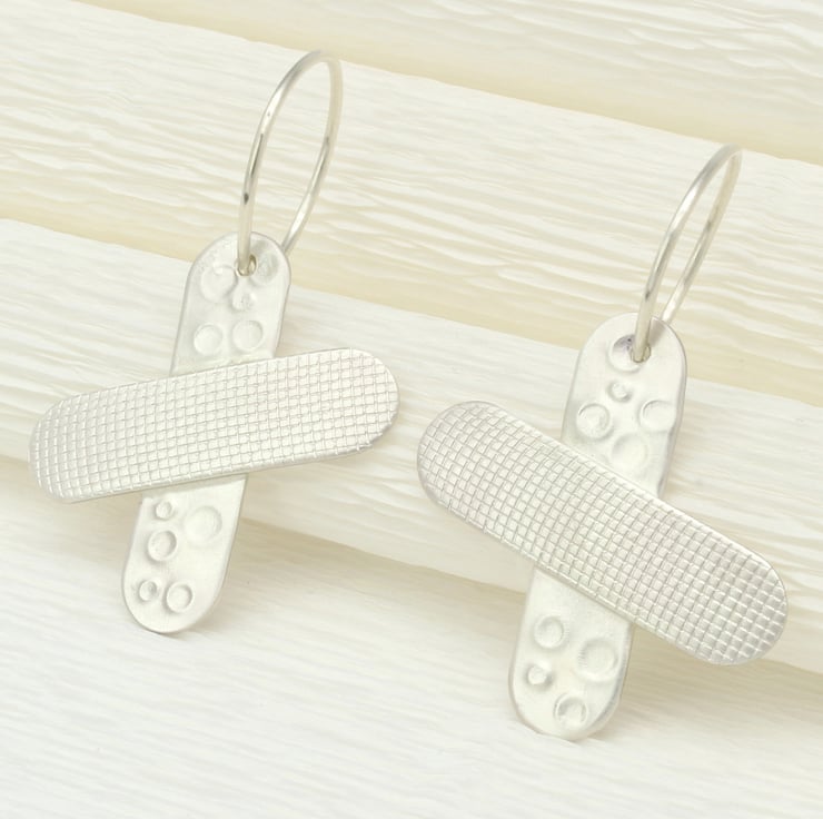 These contemporary earrings have been handmade from sterling silver. Two elongated, rounded rectangular pieces of silver have been embossed with interesting patterns and soldered together to form random cross shapes. They measure 19mm x 28mm with a total drop length of 40mm, hang on sterling silver earring hoops and have a matt, satin silver finish.