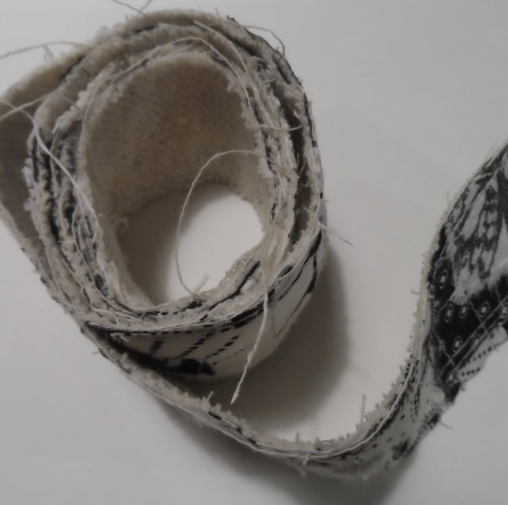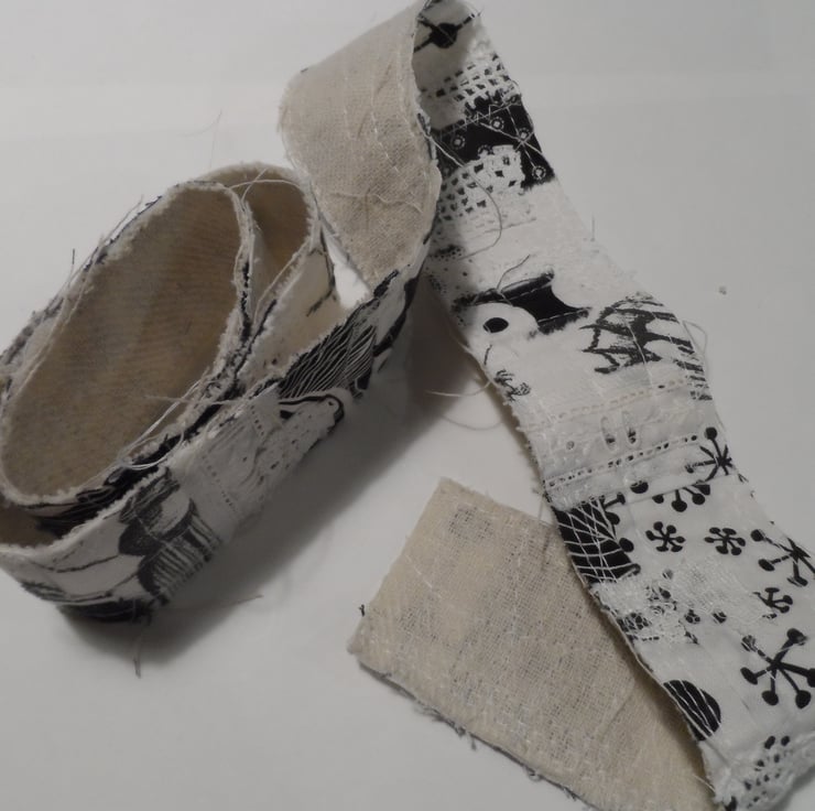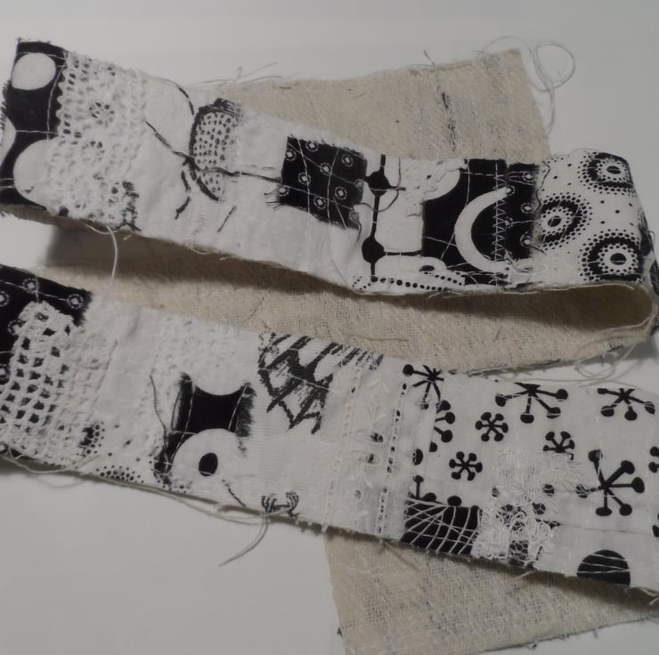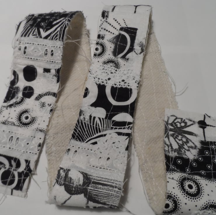 This is a handmade made snippet roll made from a range of coordinating fabrics including various printed cottons and lace. The fabrics are sewn onto a backing of cotton fabric and machine stitched into place. The main colours are black and white.