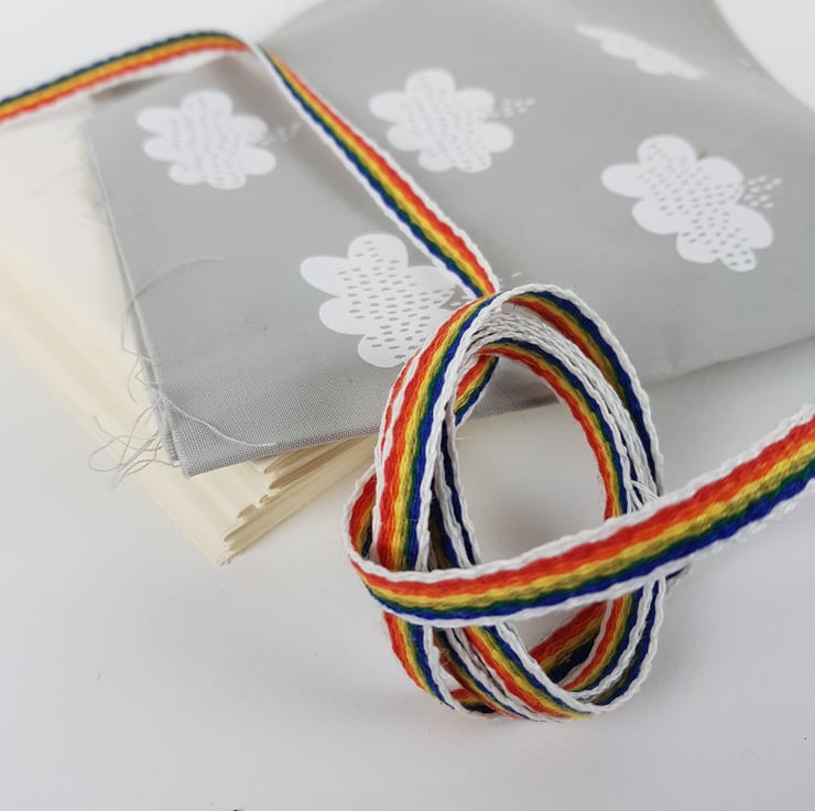Get rid of boring grey herringbone tape. This rainbow tape can brighten up your books and make them shine. Instead of just hiding it behind a spine and glueing it between board and paste-down, you can lace it through your board so that it shows on the covers. You can also leave the spine uncovered and show off your colourful tape there.