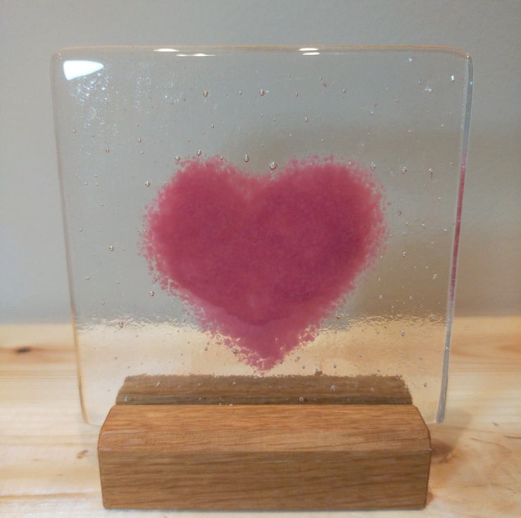 Handmade in my home studio, this is a beautiful 9cm square fused glass piece made by using two pieces of glass in my kiln for over 12 hours. I create the heart using ground glass which is fused on to the surface of the square.