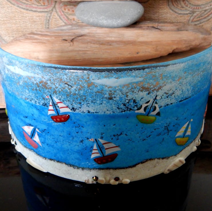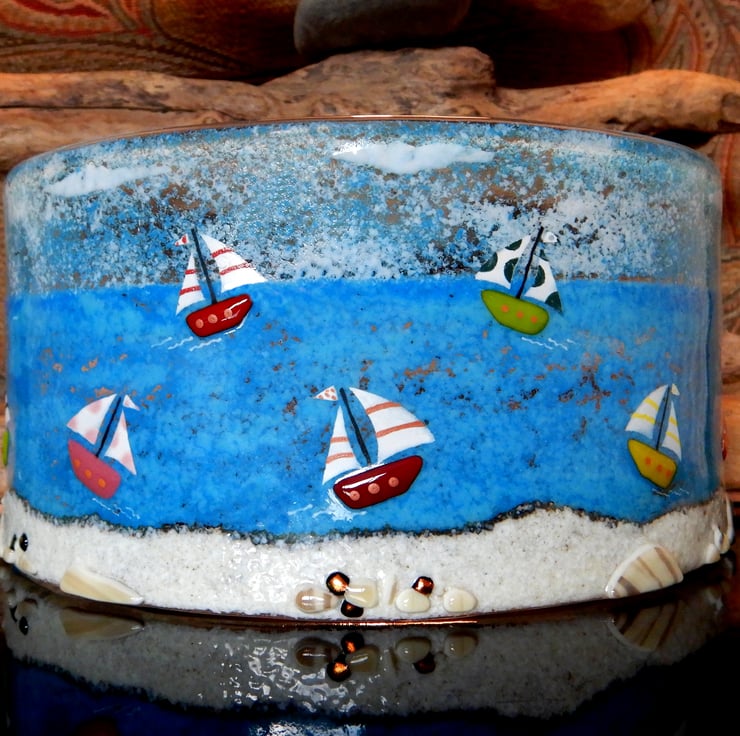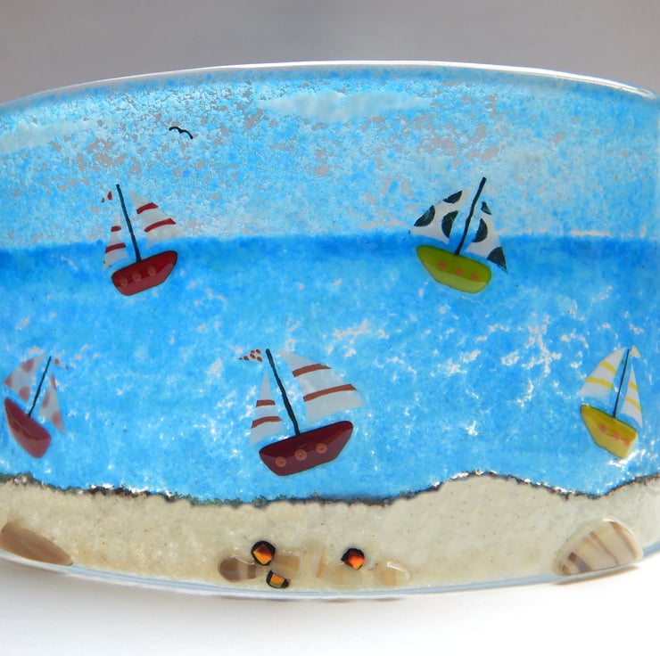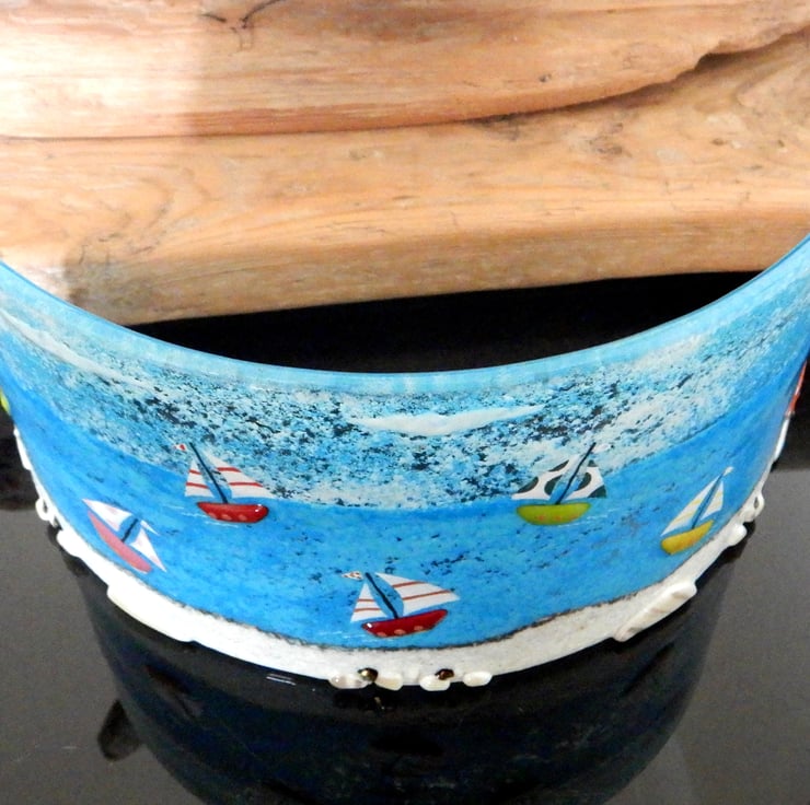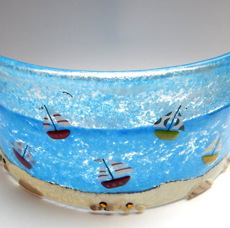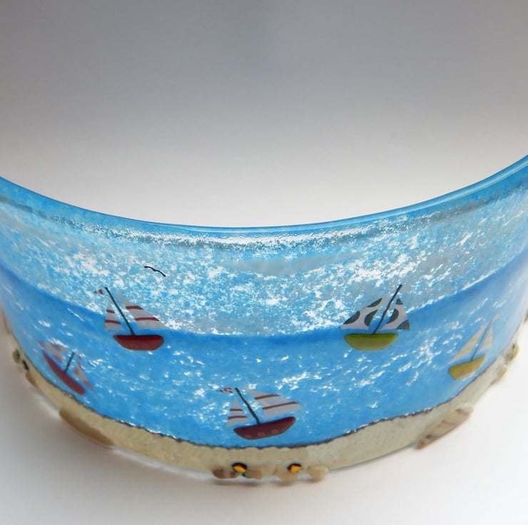 ''Sailing'' is made completely from glass which has been fused in my kiln. There is no enamel, glass paint or any other materials used; this picture is 100% pure bullseye fusing glass!