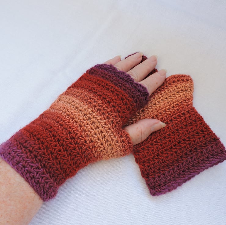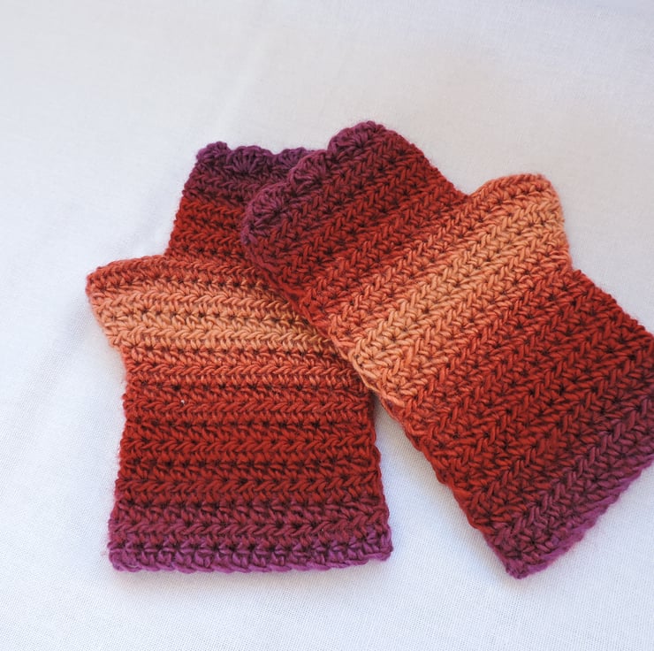 Seconds Sunday end of line ltem. Colourful adults fingerless mitts which have been crocheted using a double knit self striping acrylic yarn. Lovely warm colours of aubergine, russet, apricot and plum.. They have a plain body and are finished with a wavy edge top. A soft and cosy winter warmer, ideal for dog walkers and those who need to have their fingers free.