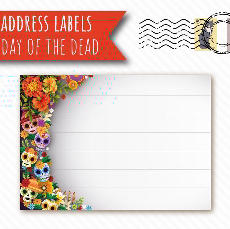 A pack of 10 x self-adhesive address labels with a colourful Day of the Dead design. Handmade by me on a digital printing press.