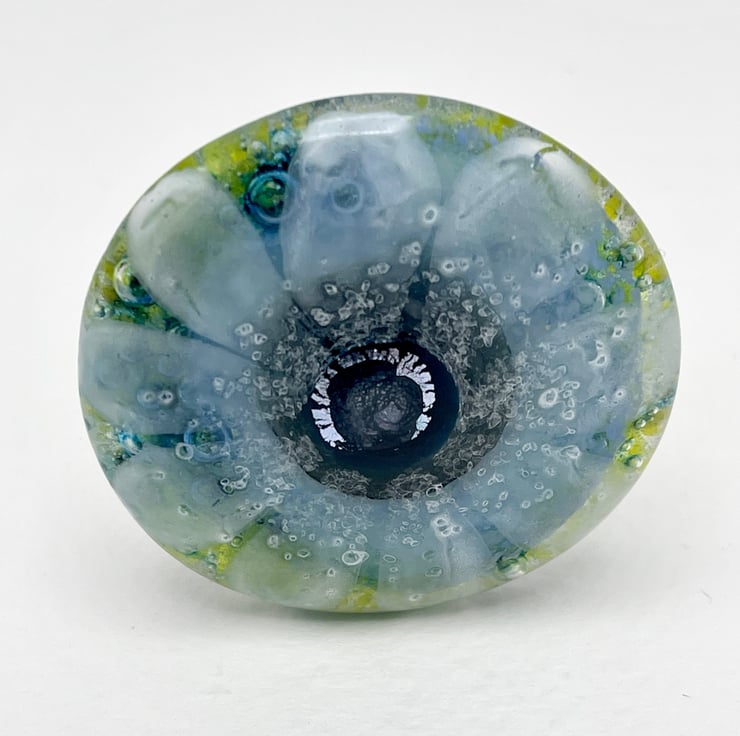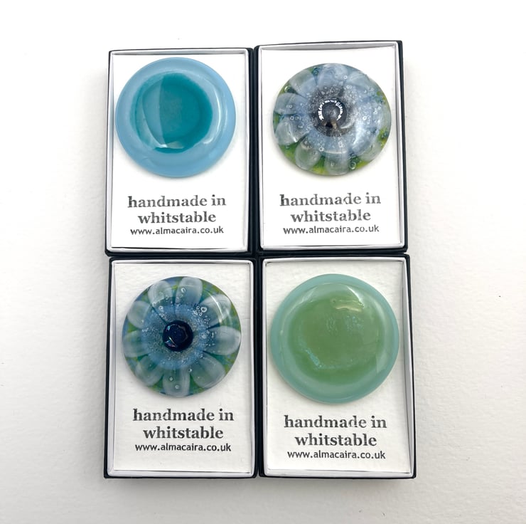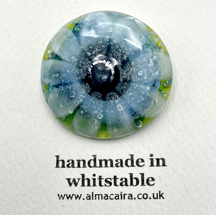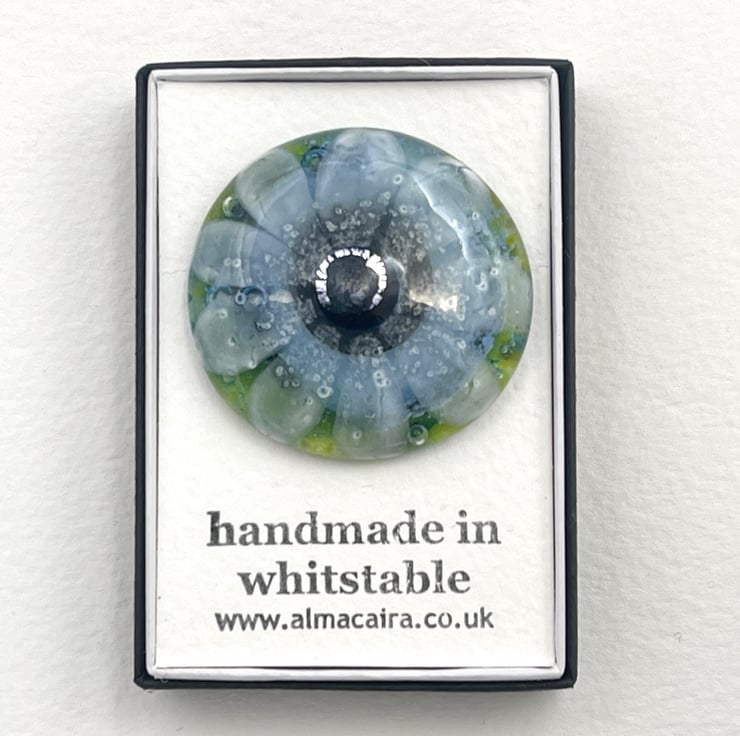 Created from layered Bullseye glass in my Whitstable garden studio. The white enamel painted flower has a sparkly dichroic glass centre and sits above a beautiful, blue green background. Plated sterling silver brooch back glued with epoxy resin to create a permanent bond. Supplied in a black card gift box.