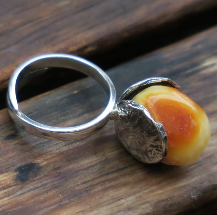 Unique amber ring place in a sterling silver setting. Oxidized to enhance design details.