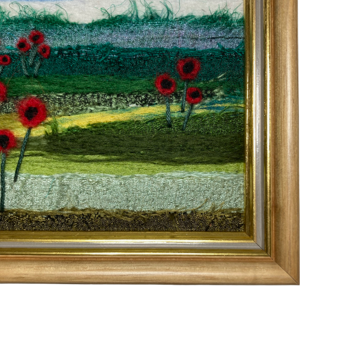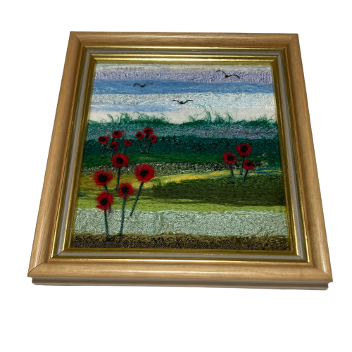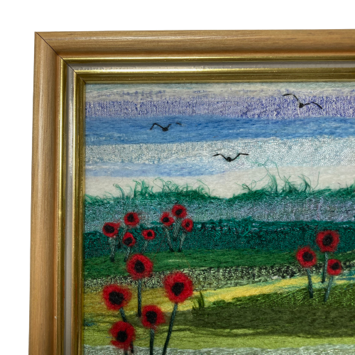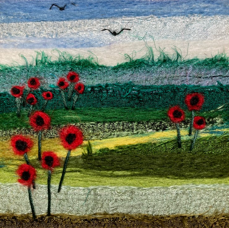 This gorgeous textile art picture has been made using strips of silk fabric needle felted to a piece of backing felt. Woollen fibres have also been added in small amounts to enhance the picture and add texture and to create the poppies. The stems of the poppies and the birds have been added with stitching. The picture shows the fields in summer with several poppies added. Needle felting the fabric and fibres creates a wonderful texture to the work and binds everything together, negating the need for any sewing.