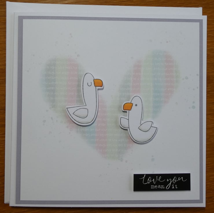 It features a pair of die cut gulls which have been hand stamped and inked and slightly raised above a printed image of a heart in stripes of pastel colours surrounded by ink splatters,.