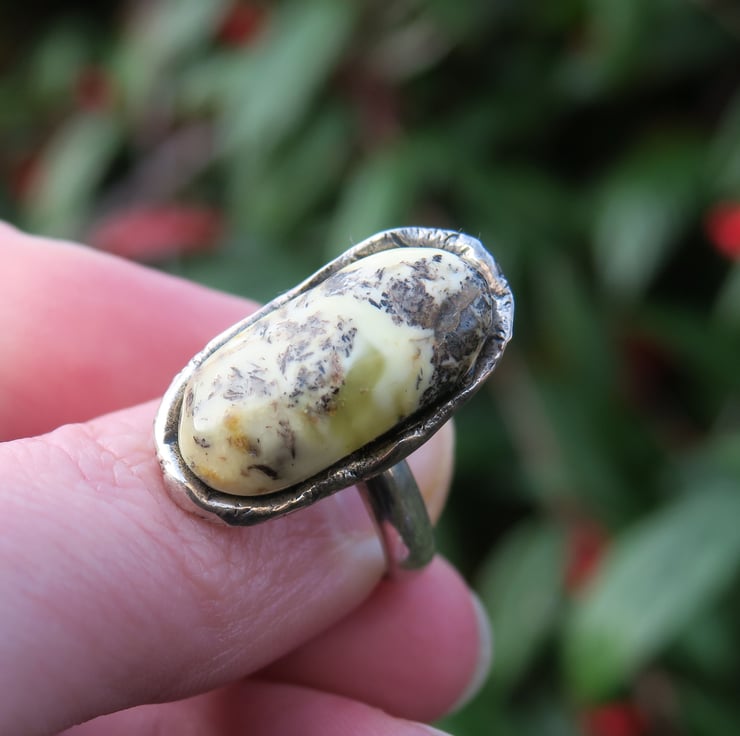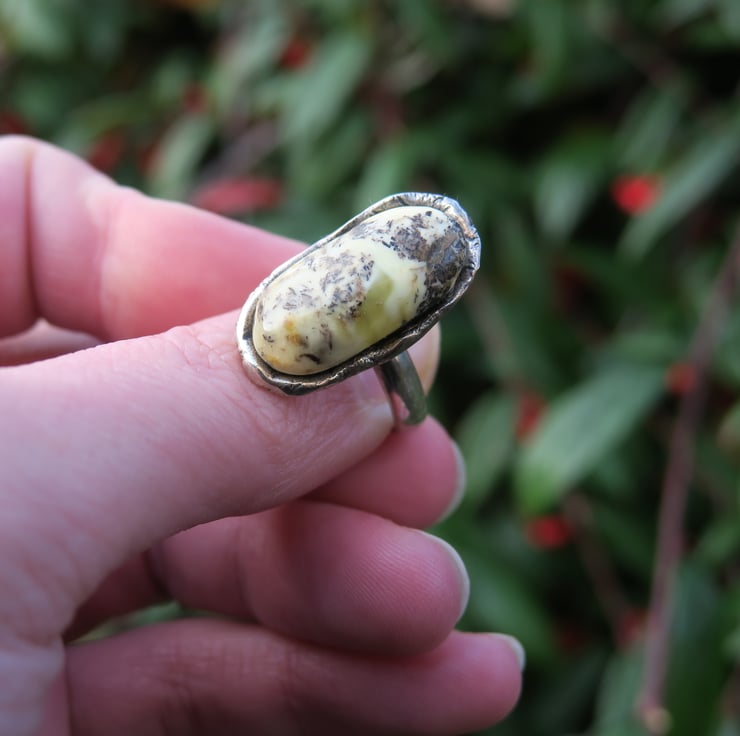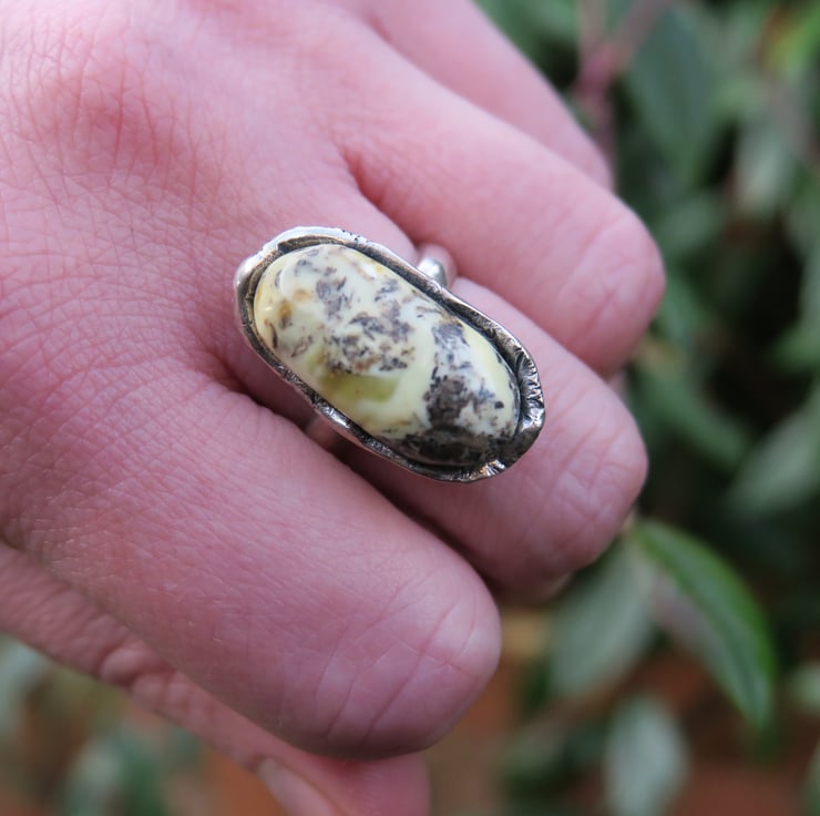Baltic amber ring place in a sterling silver setting. Slightly oxidized to enhance design details.