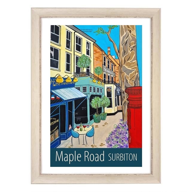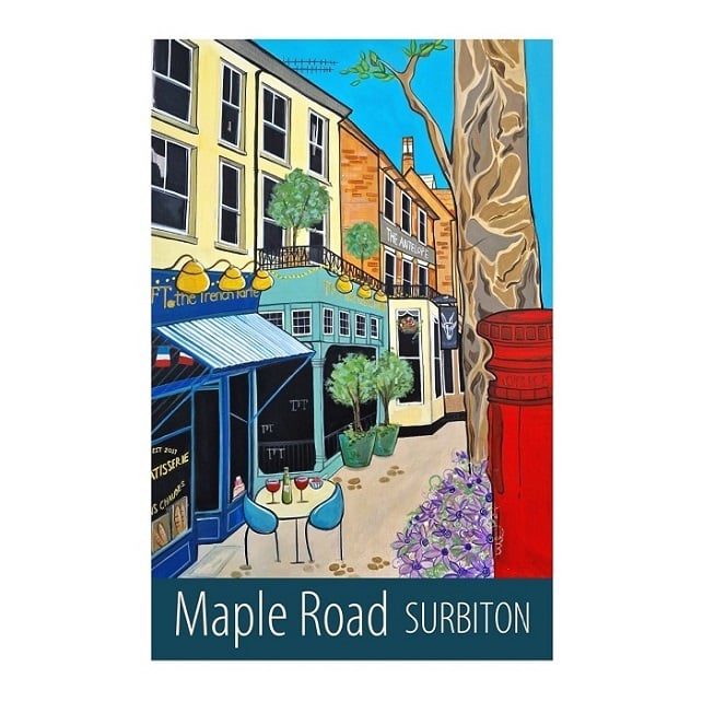 A contemporary travel poster style print of lovely Maple Road and its cafes and restaurants, in Surbiton, from my own original acrylic painting.