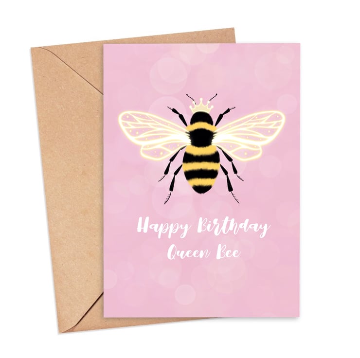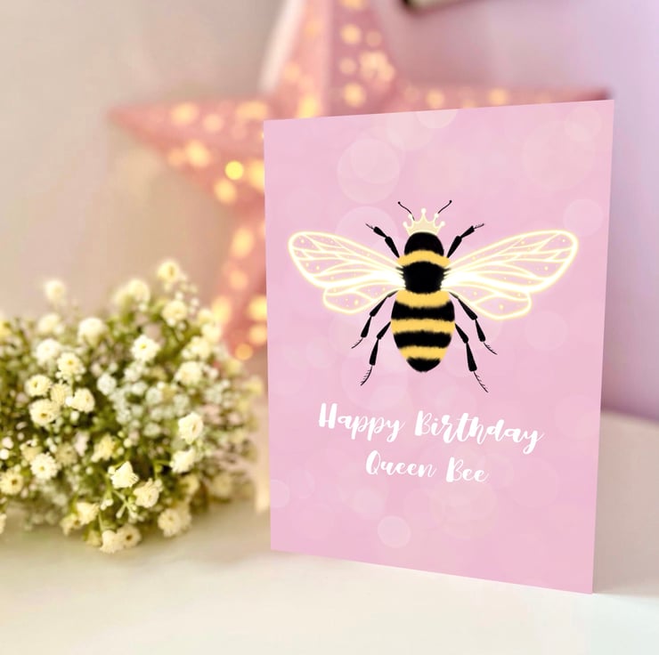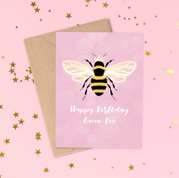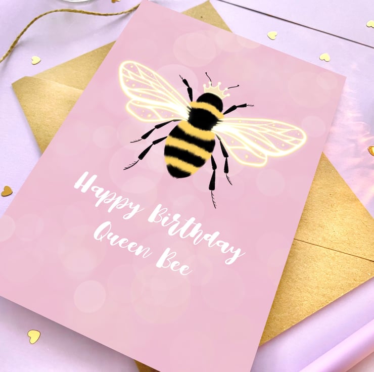 The card reads 'Happy Birthday Queen Bee'