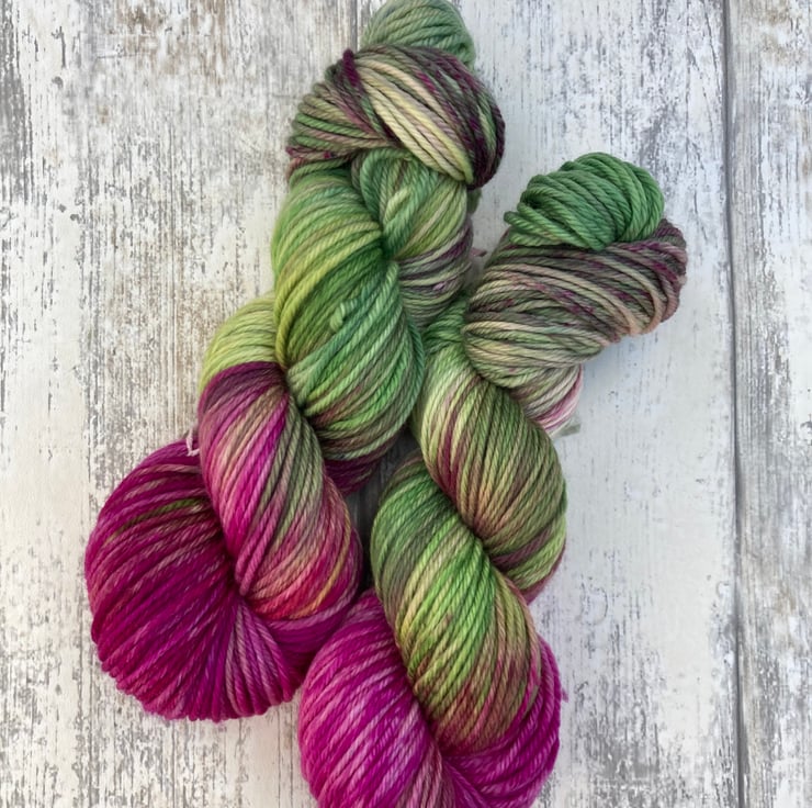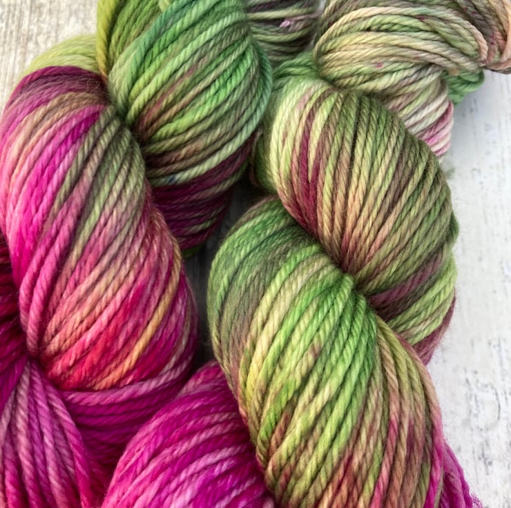 Skein of hand dyed merino yarn in my Earth Song colour way.