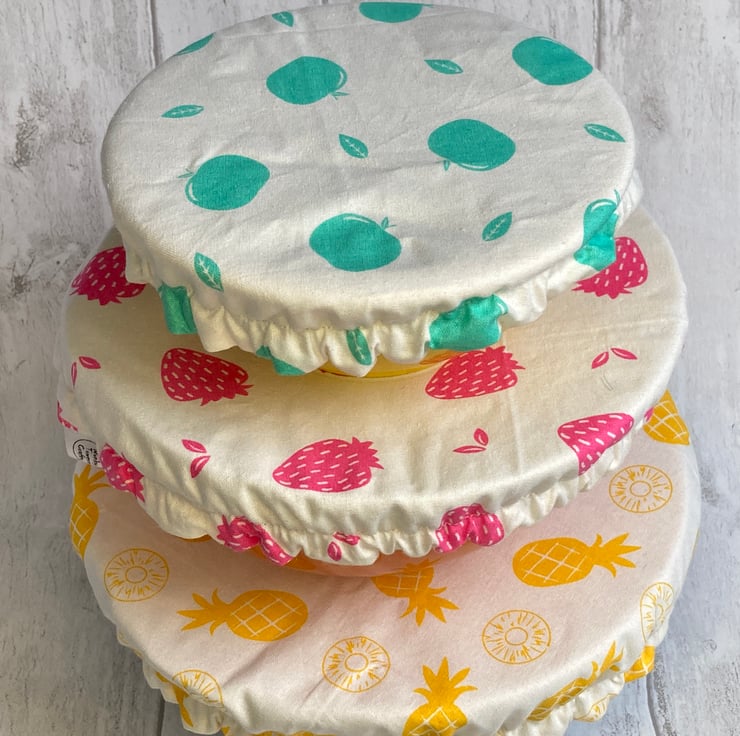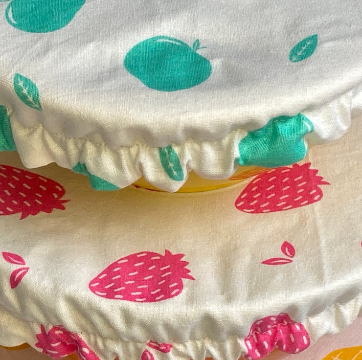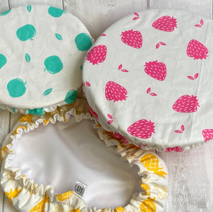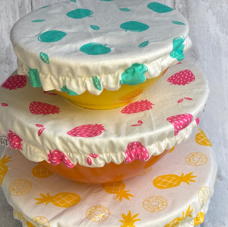 This set of 3 covers will fit bowls approximately 23cm, 19cm and 16cm (9", 7.5" and 6"). They are made from 3 coordinating fabrics featuring pastel fruit designs on a cream background.