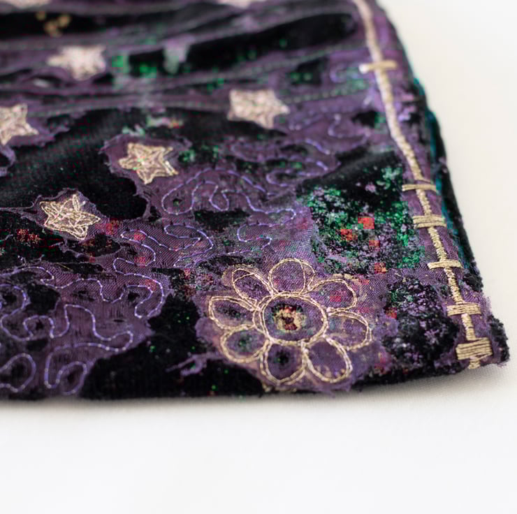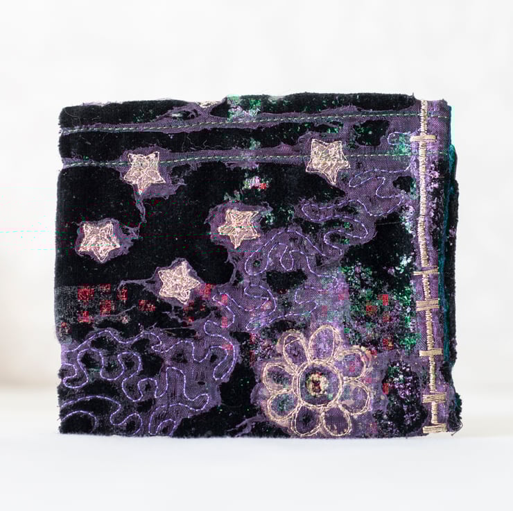The base fabric is black velvet. This has had metallic fabrics and organza applied before machine stitches using metallic and cotton threads have added to create pattern and interest. Finally, some or the organza has been burnt away to reveal patches of the velvet beneath. A richly textures and patterned fabric has been created