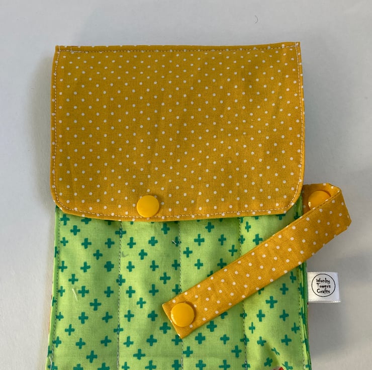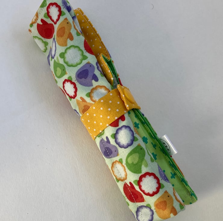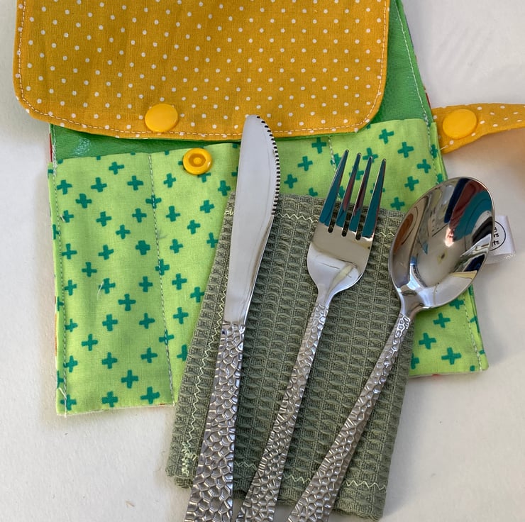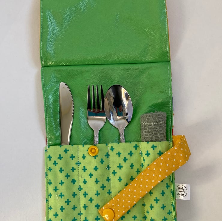 The cutlery roll is made from good quality cotton, lined with green PUL fabric. This can be wiped clean or, if necessary the whole thing can go in the washing machine.