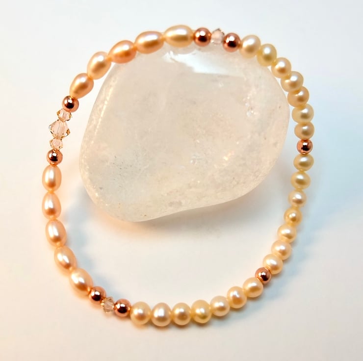 Dainty, pearl stretch bracelet in delicate shades of cream and pale peach and sparkly 'light peach' Swarovski bicones highlighted with copper rounds.