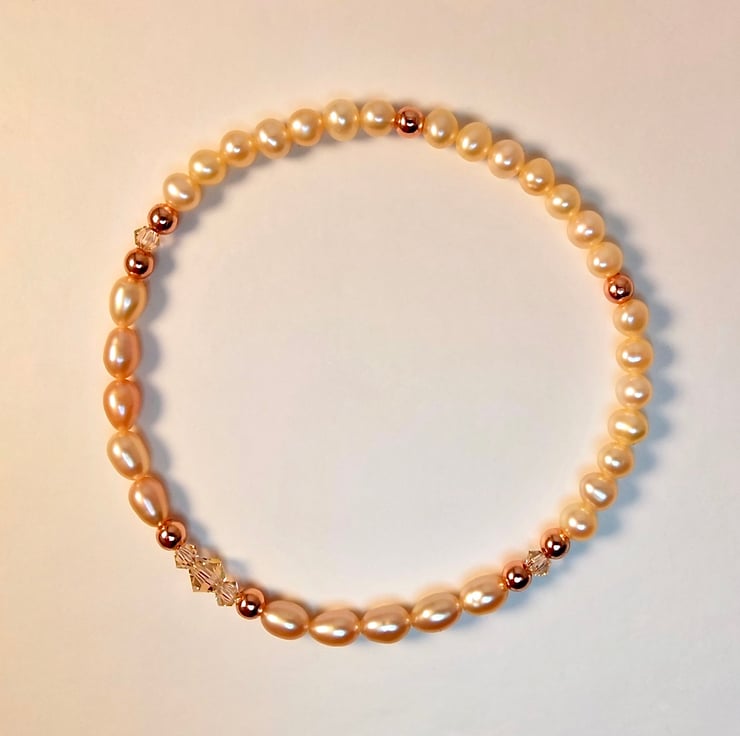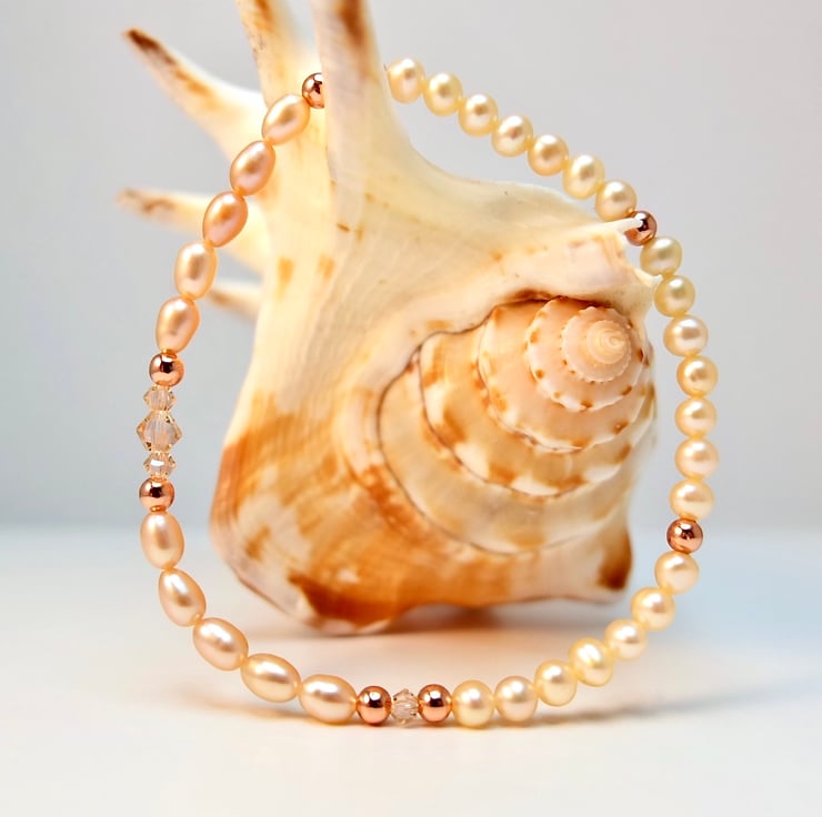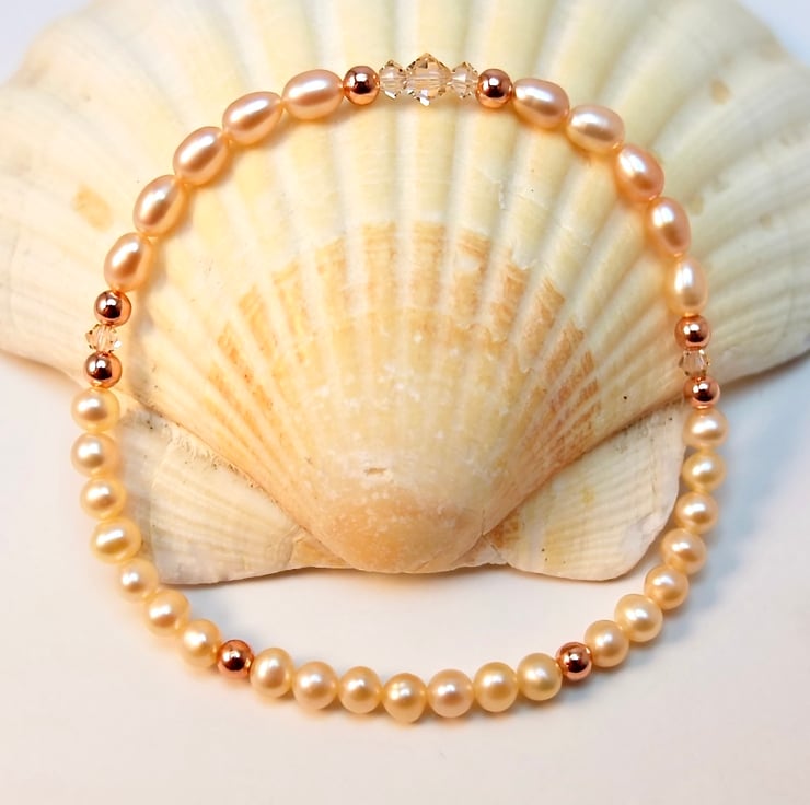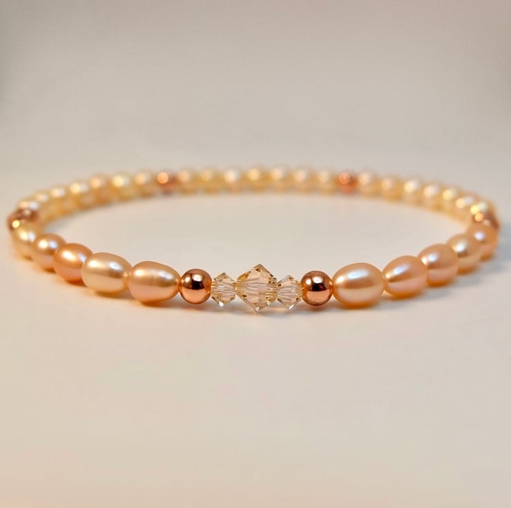 Dainty, pearl stretch bracelet in delicate shades of cream and pale peach and sparkly 'light peach' Swarovski bicones highlighted with copper rounds.