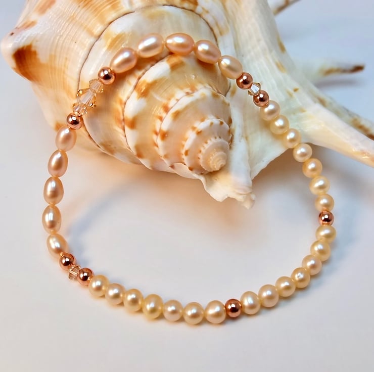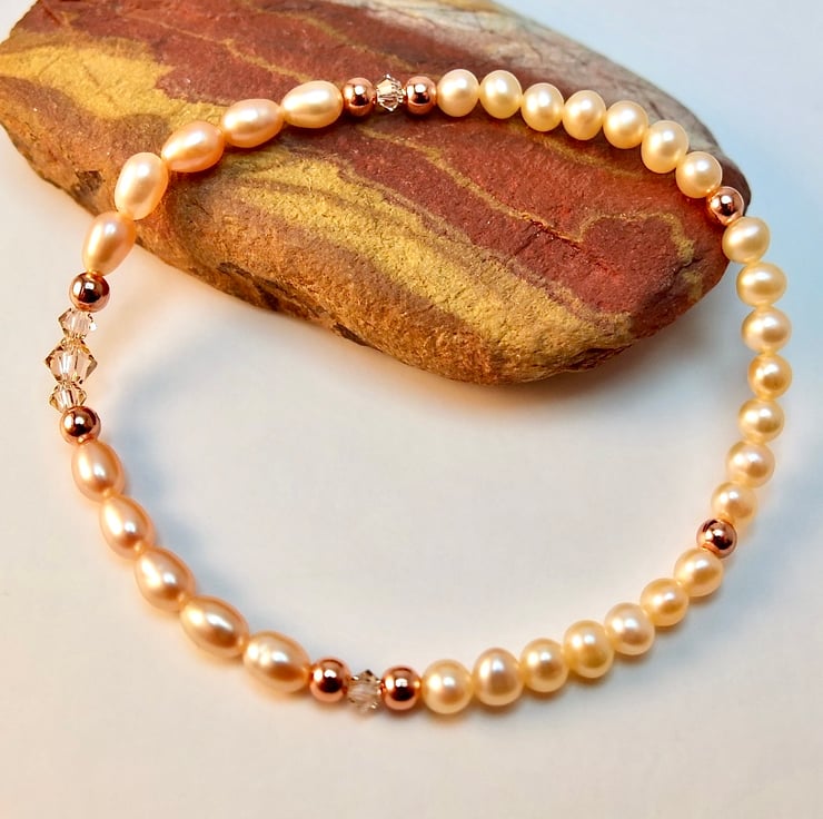 I have used two rows of five freshwaters rice pearls, approximately 4mm-5mm, in a very pale, creamy-peach colour, set with three Swarovski crystals in the centre and one at each end, bracketed by 3mm copper beads.