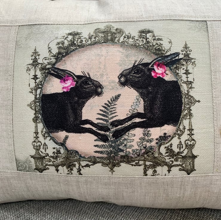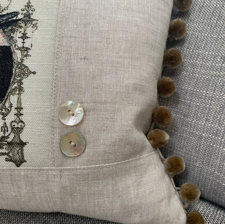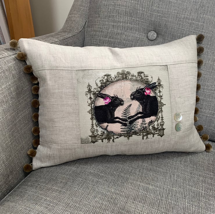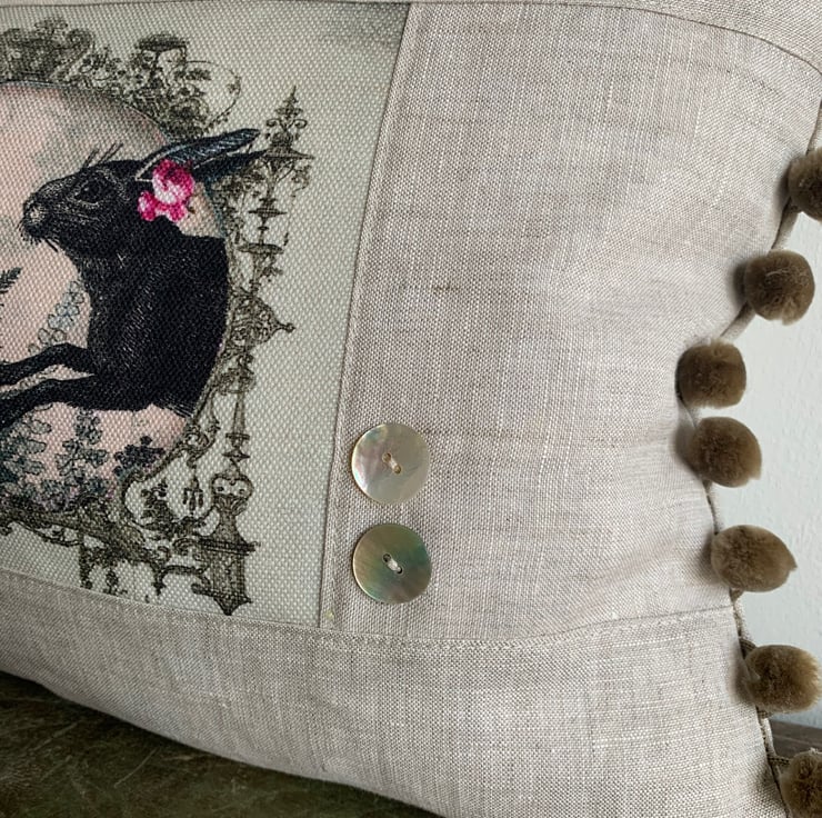 Beautiful linen cushion with a hare design panel by Marianne Ley Design. The panel is framed with fine beige linen and trimmed on the ends with velvety pompoms. Two mother of pearl buttons add a finishing touch.