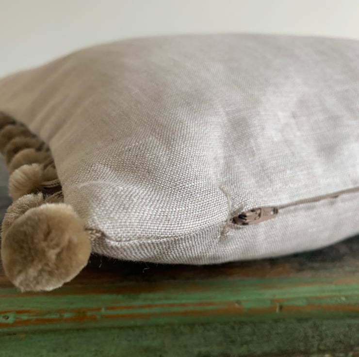 The cushion comes with a feather filler and measures approx 40x30cm excluding pompoms. It fastens with a zip in the bottom seam.
