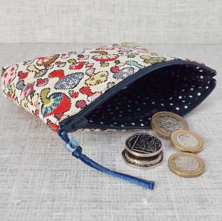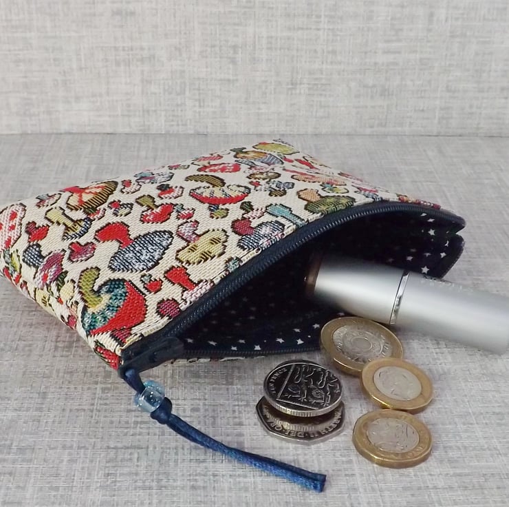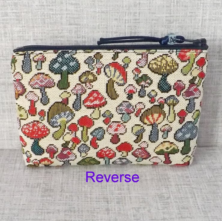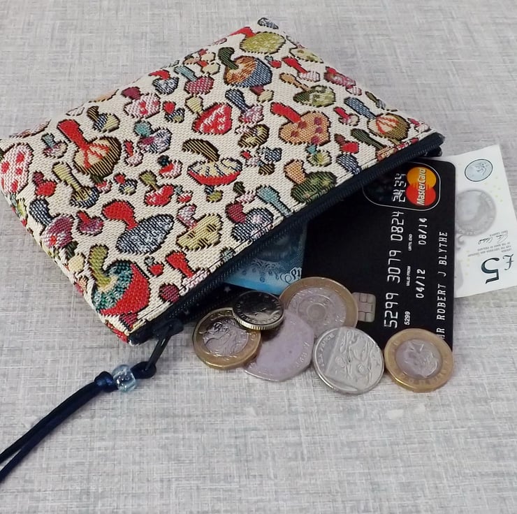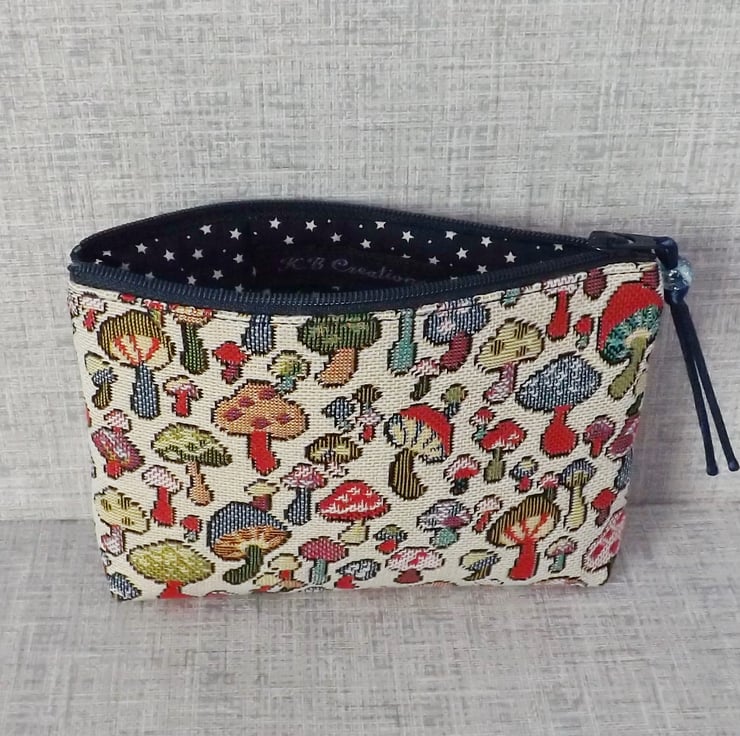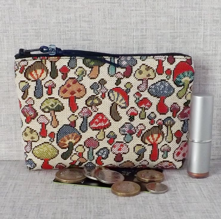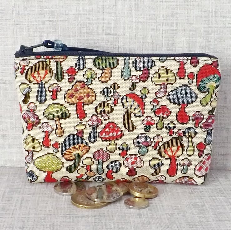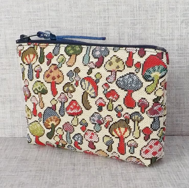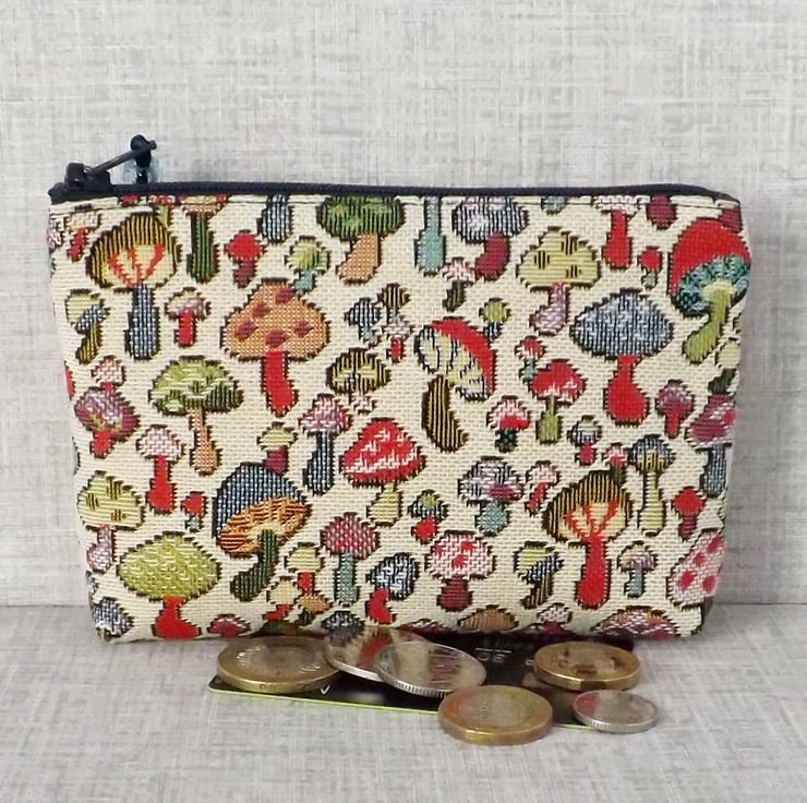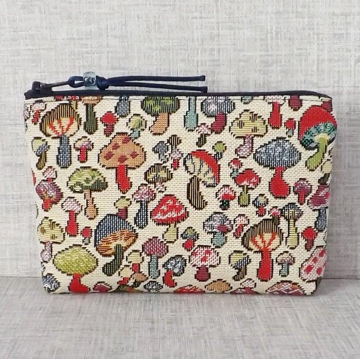 A large coin purse made from a tapestry canvas fabric with a mushrooms design in various different colours, on a cream background.