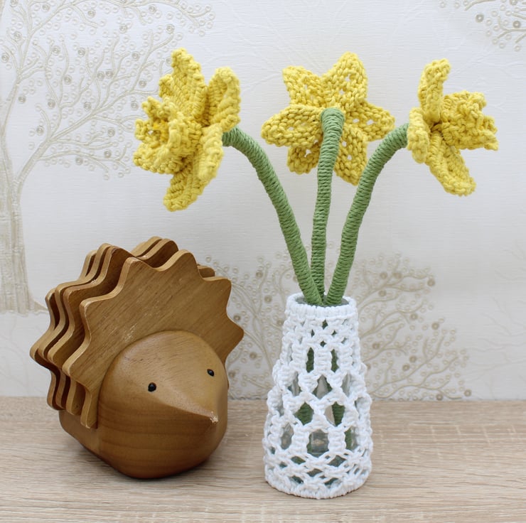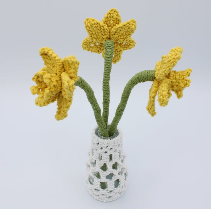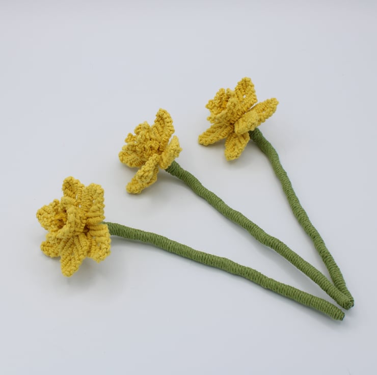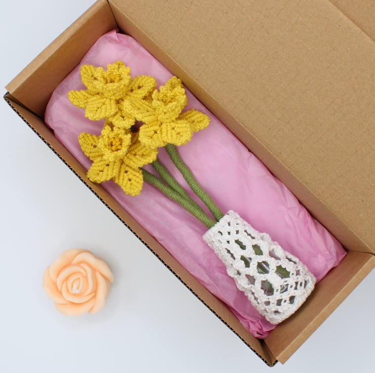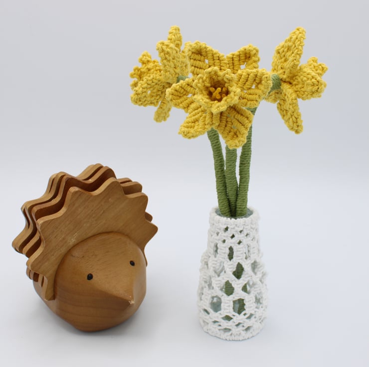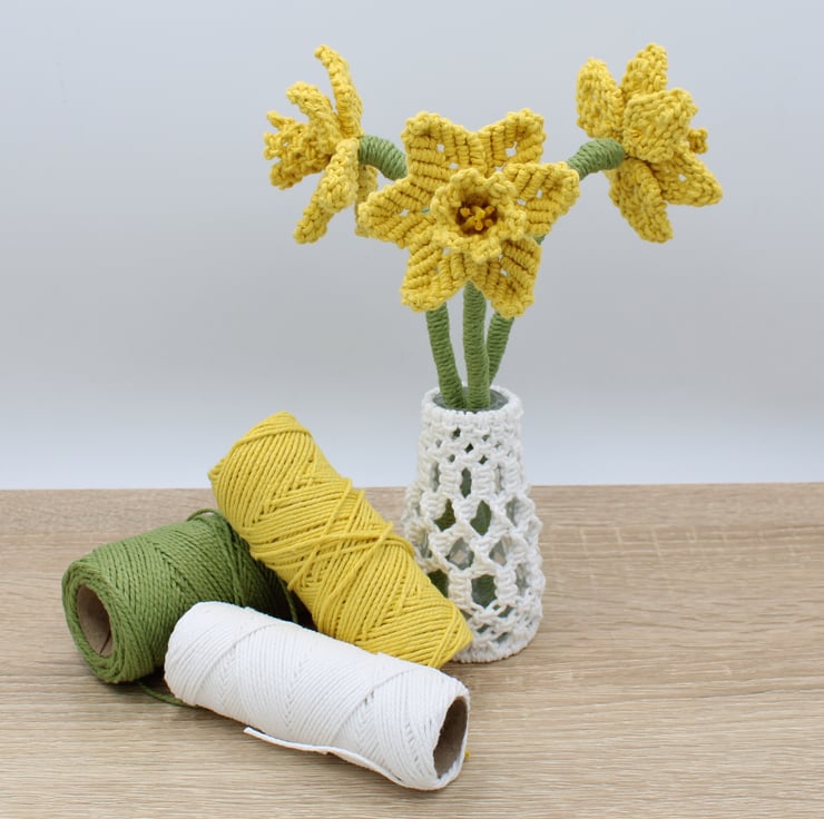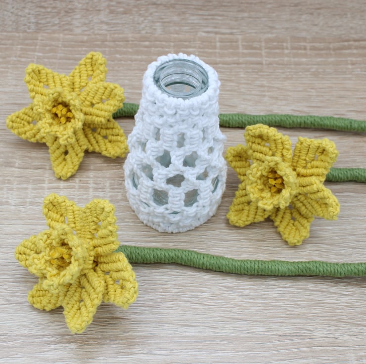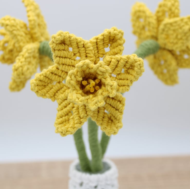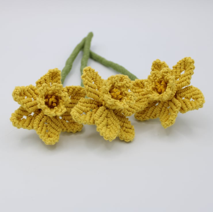 Each knot on every petal is hand tied and all components to the flowers are made individually before tying together as a daffodil. A piece of florists stub wire runs through the stems making the daffodils poseable. Macrame is not a quick craft and many hours are lovingly put in to bring about this pretty little flower display.