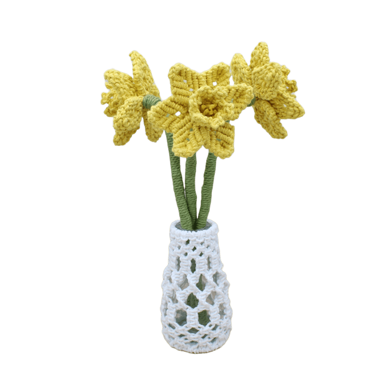 Spring is in the air when the daffodils appear and with them comes hope for warmer days. A cheerful flower that brightens our parks and gardens so much so that we often bring these little rays of sunshine into our homes as cut flowers, but they never last long. Now you can have these happy little flowers all year long with this mini vase of handmade macrame daffodils.