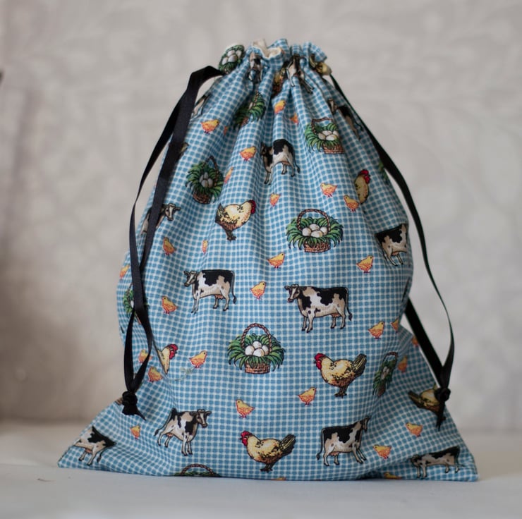 - features a pretty print of cows, eggs and chickens - a farmyard scene!