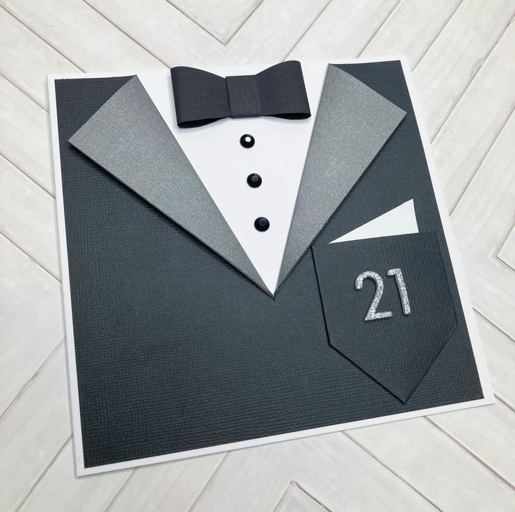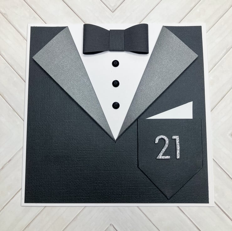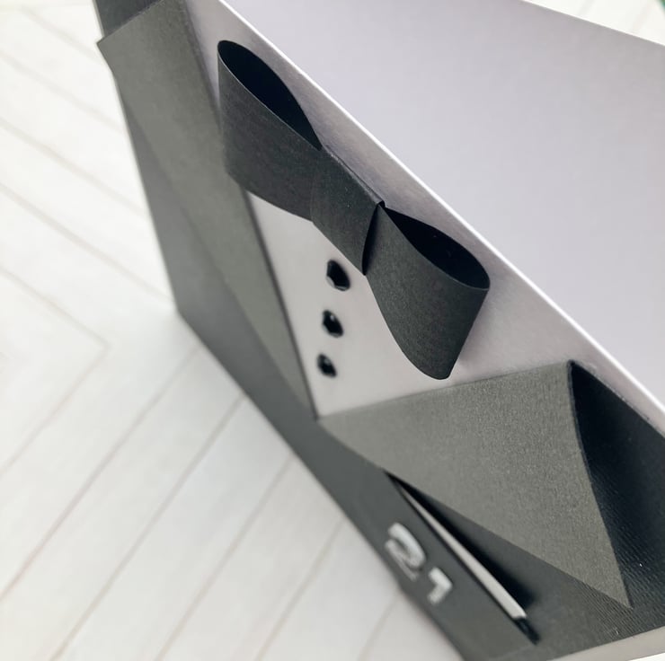 The lapels of the tuxedo are raised and folded over to reveal grey in the reverse. There is also a real pocket with a handkerchief peeking out and a black three-dimensional bow tie. Black embellishments create the effect of three buttons and the card is finished with a silver glitter 21 on the pocket.