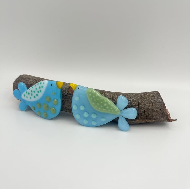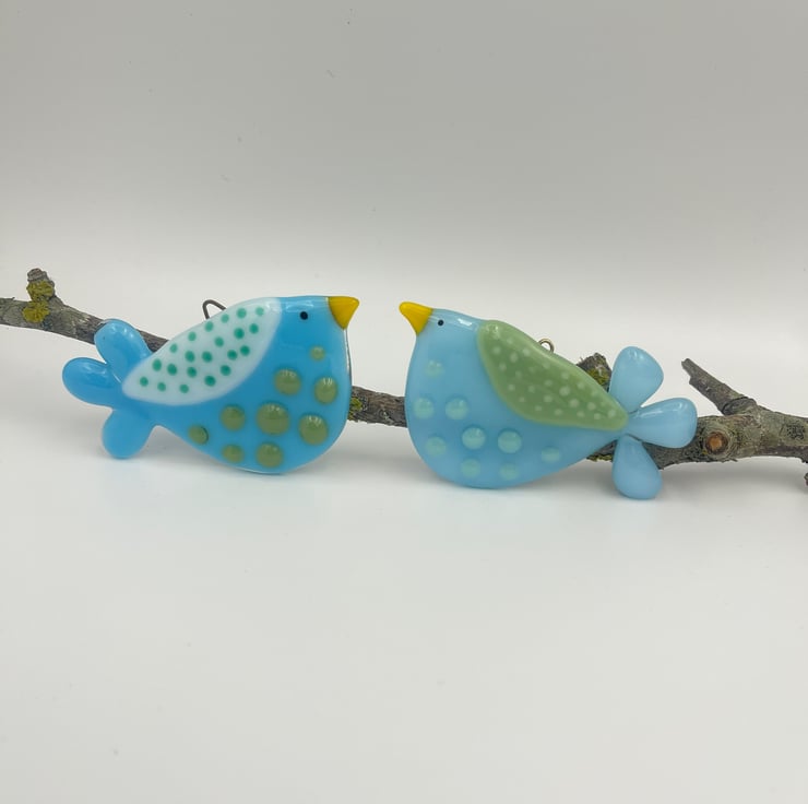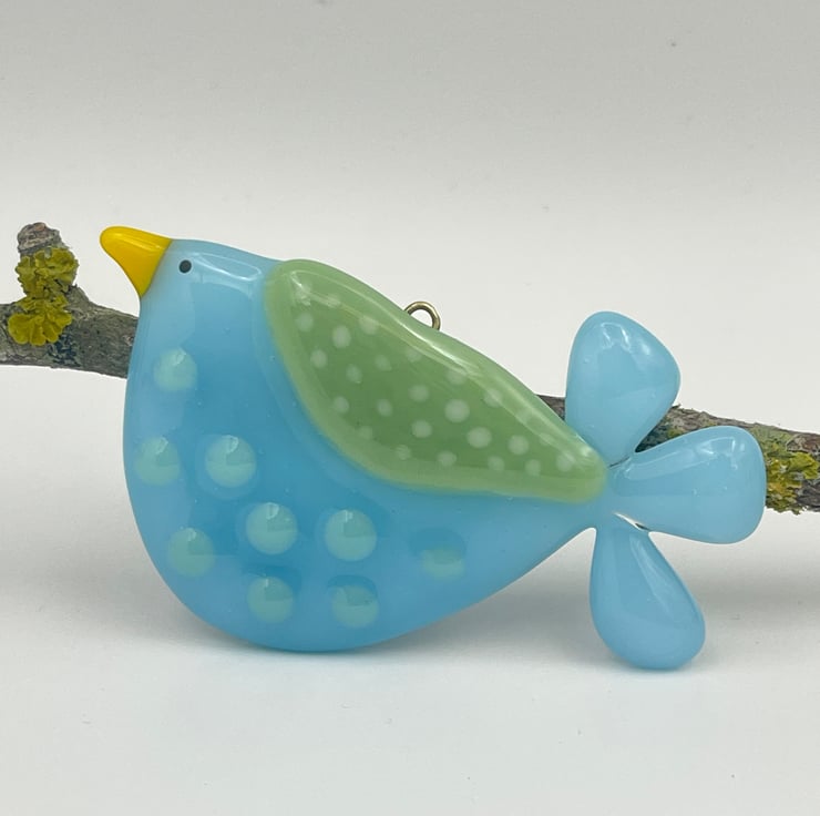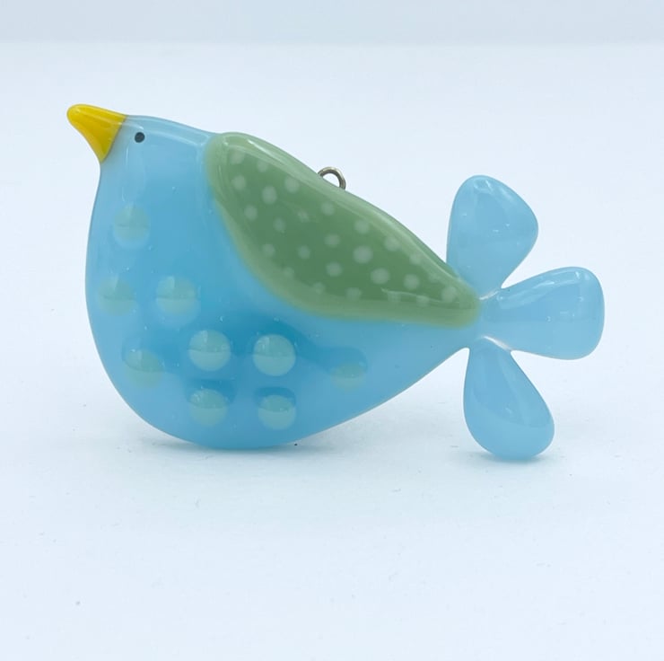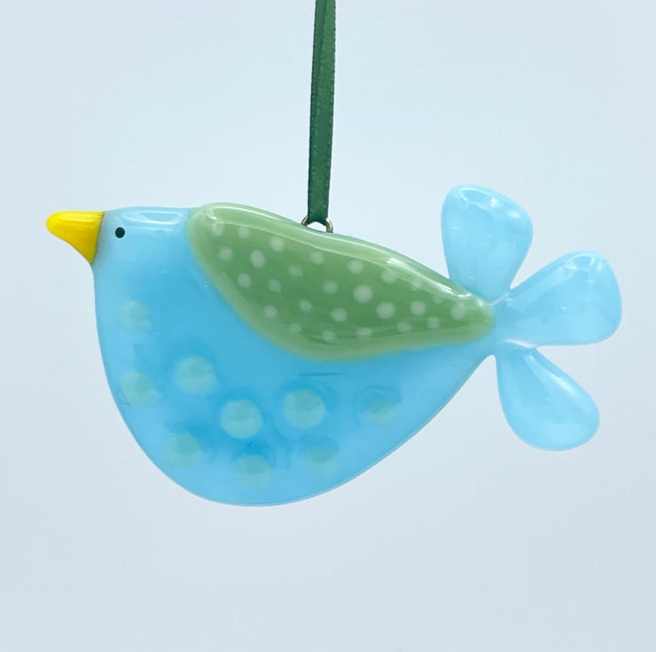 Created from layered Bullseye glass in my Whitstable garden studio. This little bluebird has pale blue spots on the body and a green wing with tiny white dotty detail. A green satin ribbon is attached to complete the design.