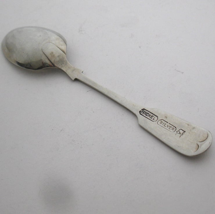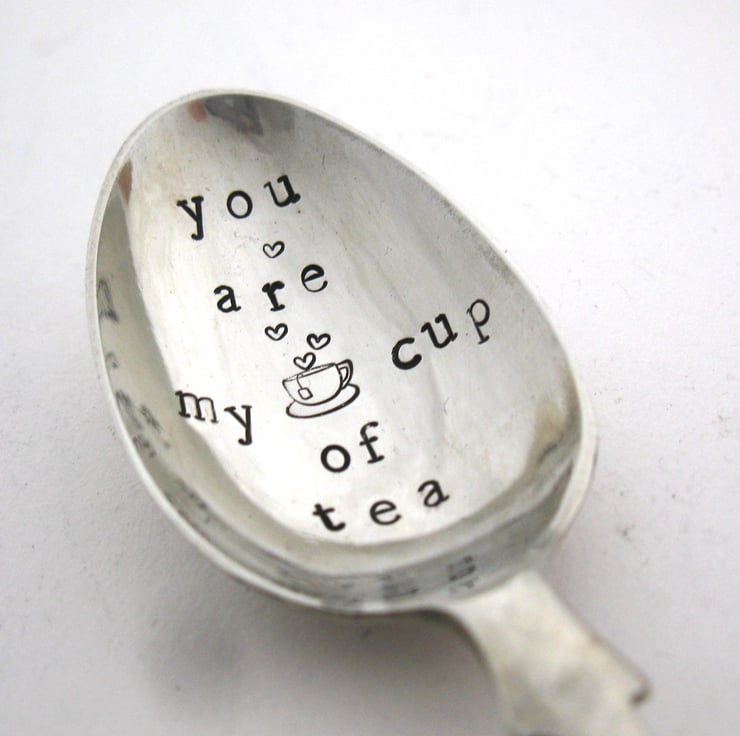A hand stamped vintage nickel silver teaspoon with the words 'you are my cup of tea' and a little teacup icon with some tiny hearts. It's an old fashioned 'fiddle pattern' spoon approx. 13cm long. The handstamped wording is coloured black with water-based acrylic paint. Hand wash with care.