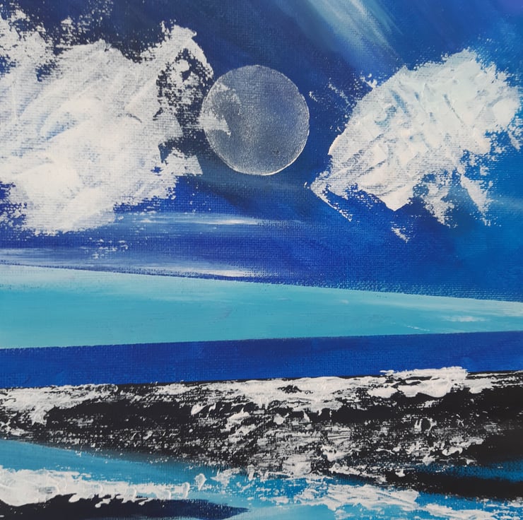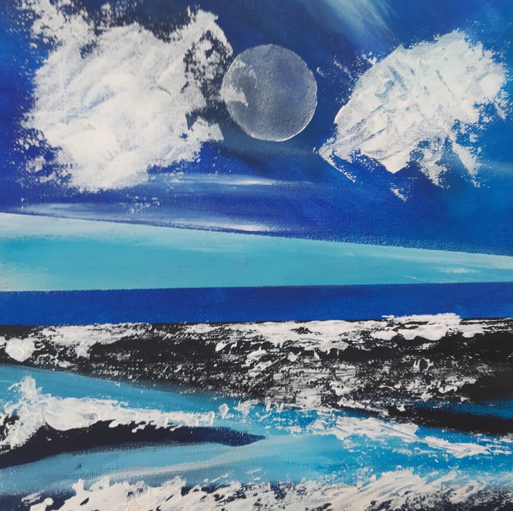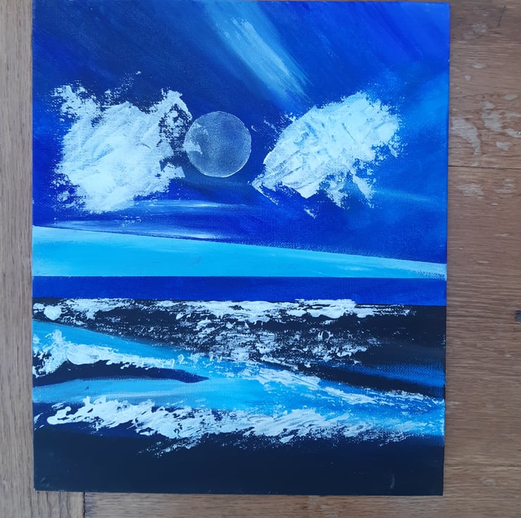 acrylic, painting on canvas board, 25.5 times 30 cm appropriately abstract sea in various shades of blue, very abstract, textured very rustic.