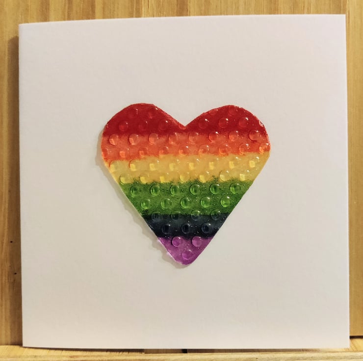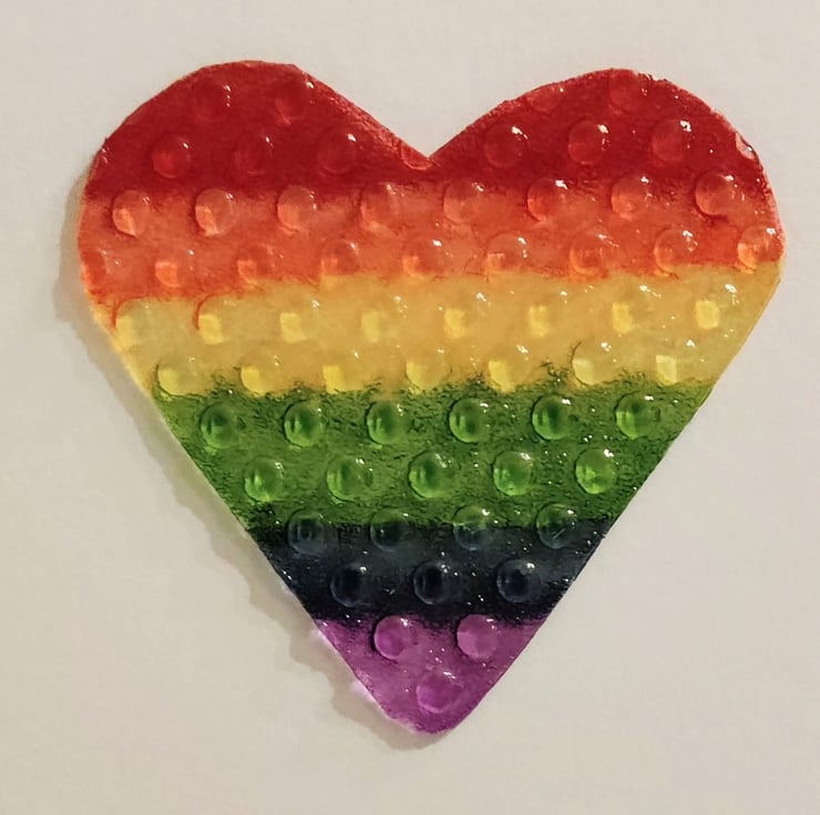 Rubber bubble textured Pride Flag heart coloured with Winsor & Newton promarkers and mounted on white card stock.