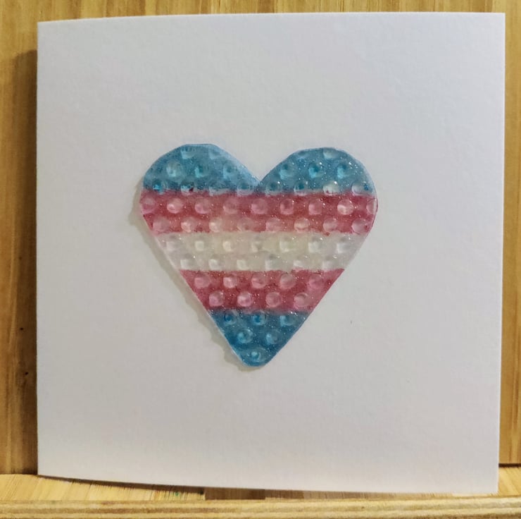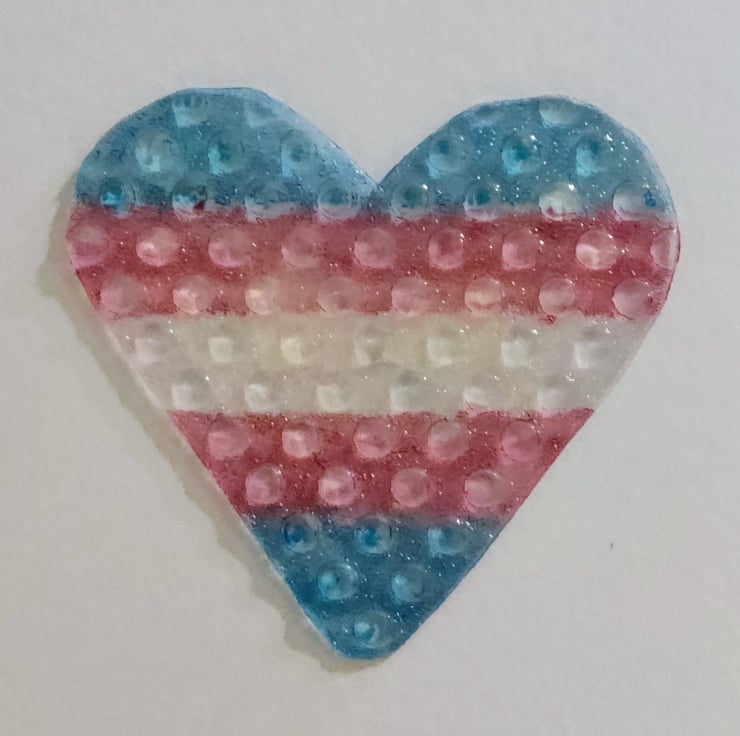 Rubber bubble textured rainbow heart coloured with Trans Flag using Winsor & Newton promarkers and mounted on white card stock.