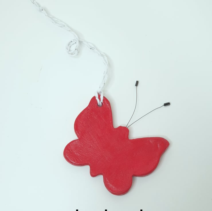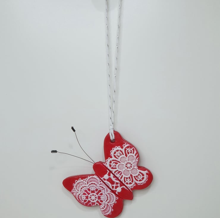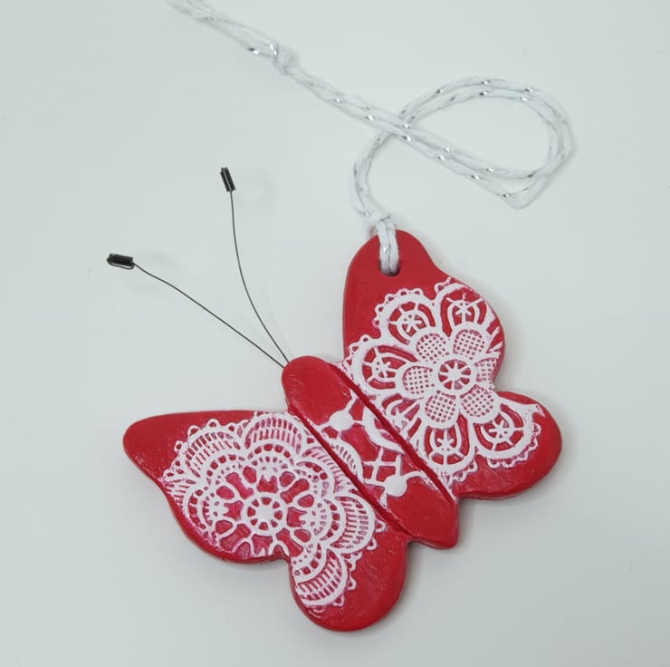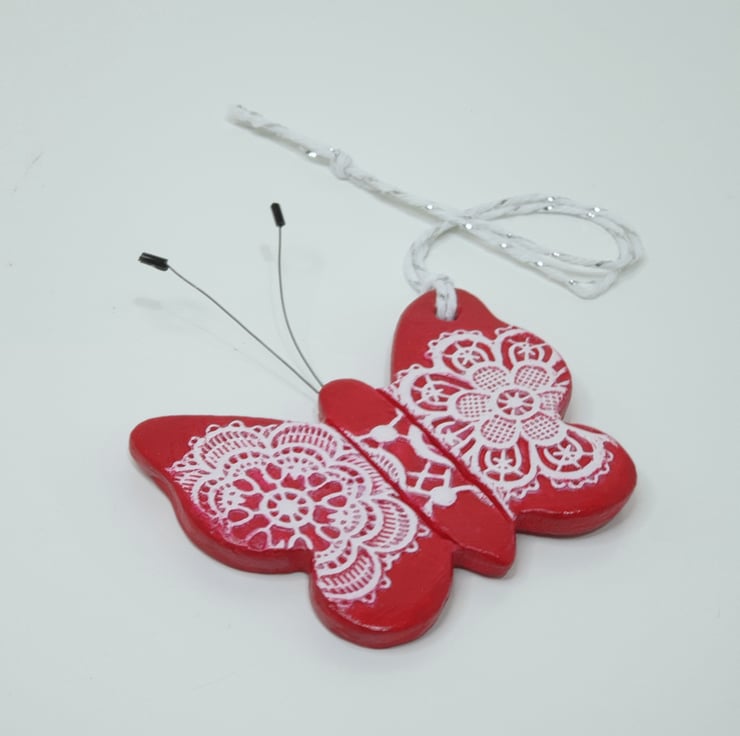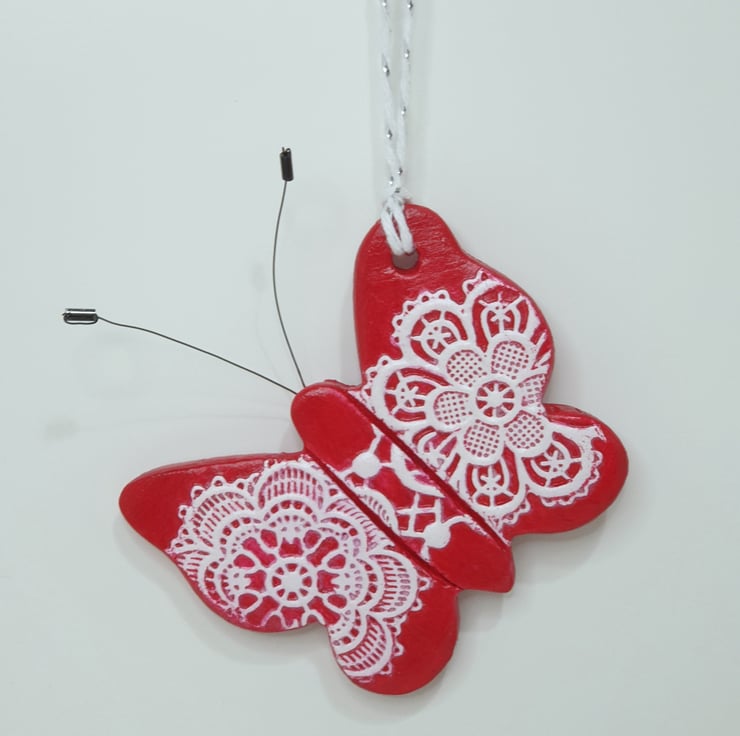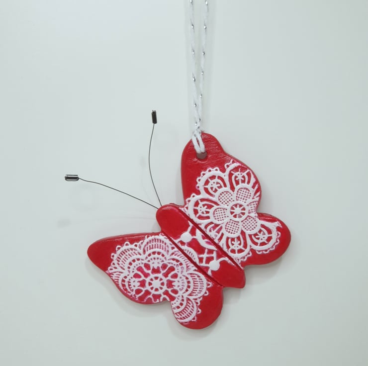 Decorative Red and white butterfly hanging decoration made from clay. This pretty butterfly has a lace pattern embossed on the front and the reverse is smooth. Red acrylic paint has been used to colour the butterfly and it has been finished with interior varnish. Black jewellery wire and beads have been used for the antennae. The butterfly comes ready to hang from white and silver twine.