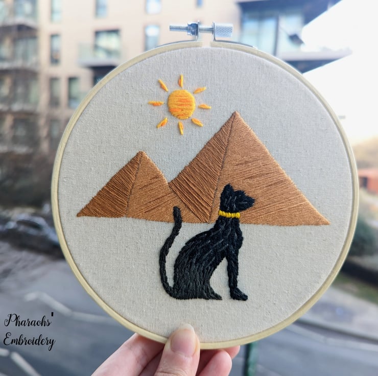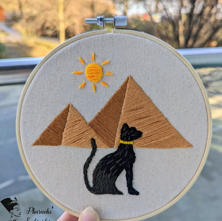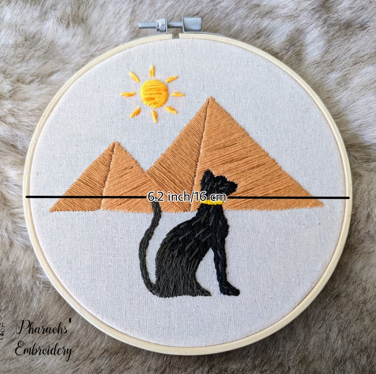 The hand-embroidered wonderful design reflects the ancient Egyptian civilization, represented by the great pyramids and the famous black pharaonic cat.